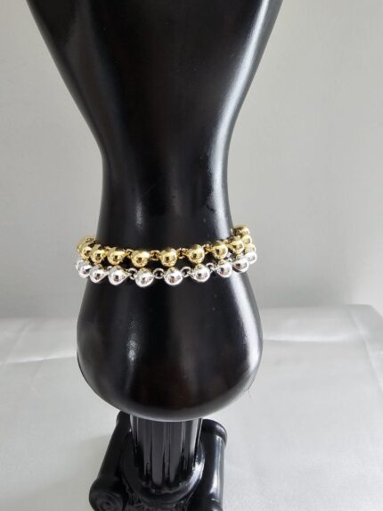 The Trio Elegance Stack is a sophisticated three-piece bracelet set crafted from stainless steel, designed to offer a chic and versatile accessory for any occasion. The set features a striking combination of gold, silver, and bronze bracelets, each adorned with alternating large and small balls that add texture and visual interest.