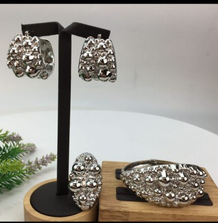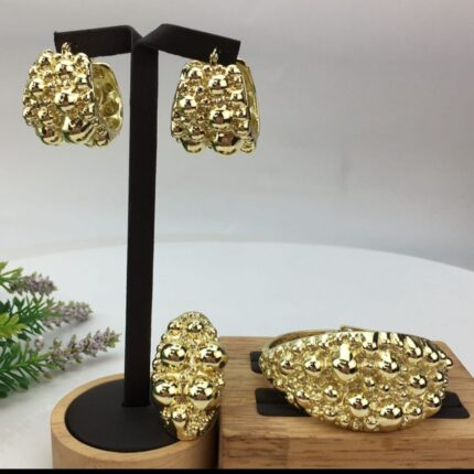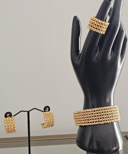 “Diamond Cut Bracelet Set” is a stunning jewelry collection that includes a bracelet, earrings, and a ring, available in gold, silver, and a unique three-toned combination. Each piece in this set is meticulously crafted with a textured design featuring small, delicate balls, adding a touch of sophistication and charm.