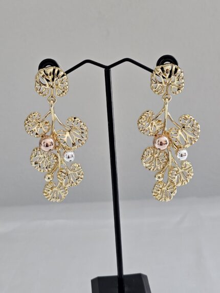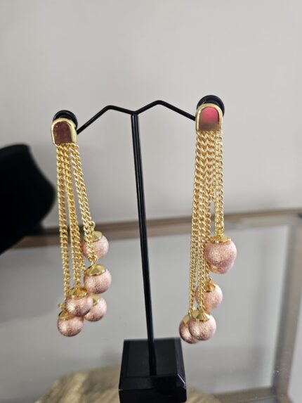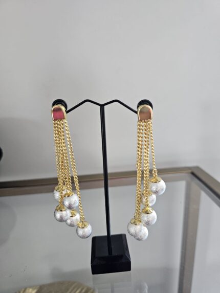 The Astral Harmony Dangle Earrings are a celestial-inspired masterpiece that perfectly combines elegance and movement. Crafted with gold strands, these earrings feature a stunning cascade of metallic balls that come in three captivating variations: silver, gold, and bronze. The design captures the balance and beauty of the cosmos, with each ball representing a celestial body that seems to float gracefully from the sleek gold strands, creating an enchanting visual effect.