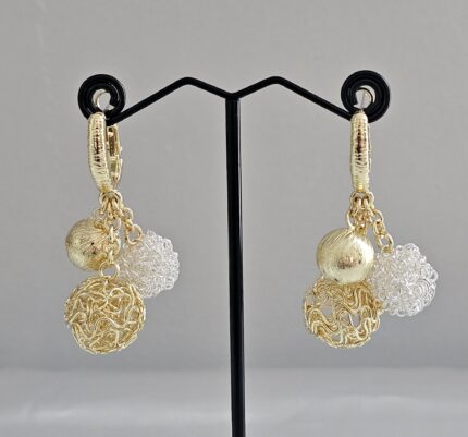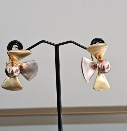 The Trinity Radiance earrings are a stunning example of modern elegance and intricate design. Each earring features a three-arm fan-like structure, creating a dynamic and eye-catching silhouette. The arms are three-toned, blending shades of gold, silver, and rose gold to create a harmonious and versatile color palette.
