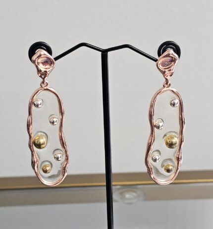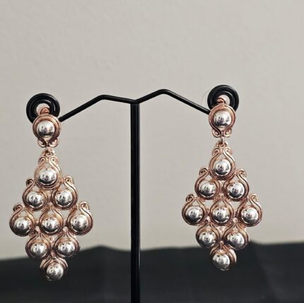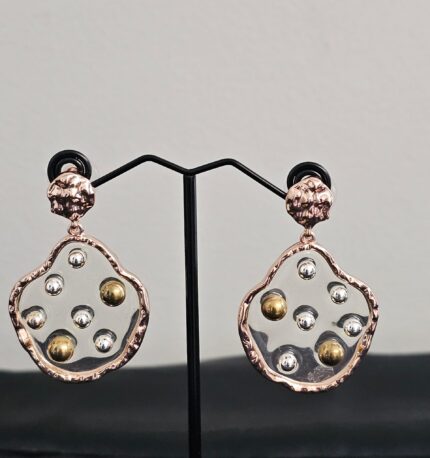 The Bronze Elegance earrings are a stunning fusion of classic and contemporary design elements. Each earring features a bronze outline that provides a warm, earthy frame for the intricate detailing within. Inside the bronze outline, the earrings are adorned with silver teardrop-shaped gems.
