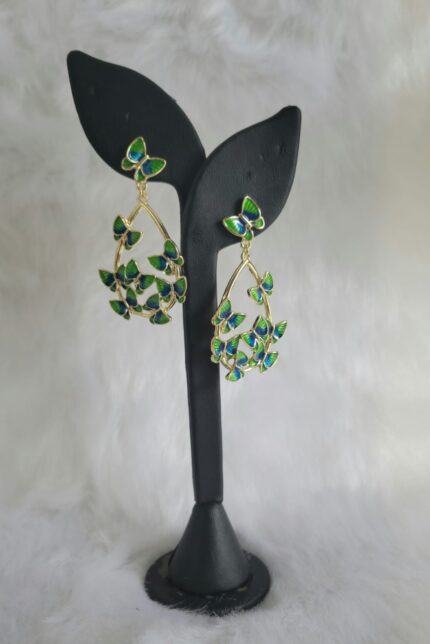 The Butterfly Garden Teardrop Earrings are a whimsical and elegant addition to any jewelry collection. These earrings feature a stunning teardrop design, adorned with vibrant green and blue gemstones that create a beautiful contrast.