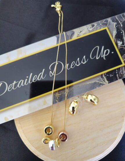 The Orbit Elegance set is a sophisticated jewelry ensemble that combines minimalist design with contemporary flair. Crafted from gold-plated non-tarnish stainless steel, this set features a necklace and matching earrings that exude modern elegance.