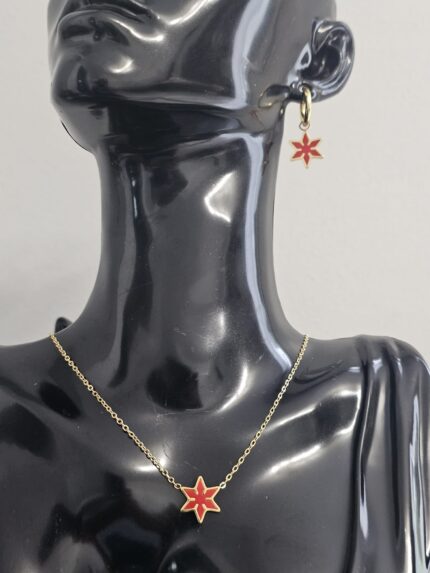 The Crimson Radiance Set is an elegant and eye-catching jewelry ensemble crafted from high-quality stainless steel, designed to shine with a touch of sophistication. Both the earrings and necklace in this set feature a striking combination of vibrant red faux rubies and sparkling faux diamonds, offering a luxurious look without the hefty price tag.