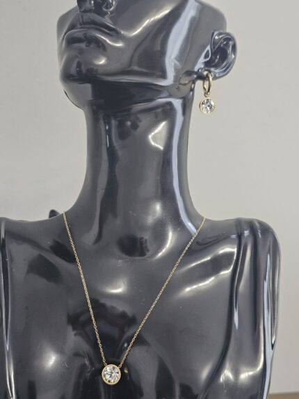 The Luminous Symphony Set is an enchanting jewelry collection that harmonizes elegance and brilliance in every piece. This exquisite set includes a pair of earrings and a matching pendant, each featuring a radiant round-cut central gemstone that captures and reflects light with mesmerizing clarity.