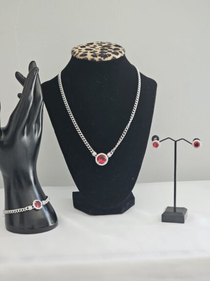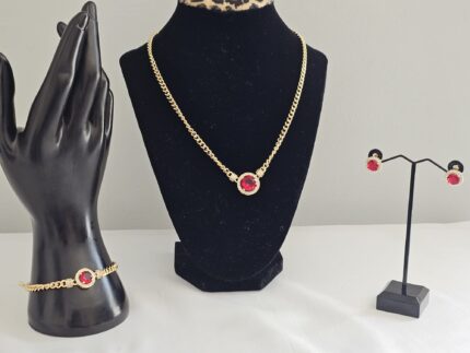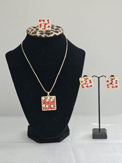 The Crimson Elegance Jewelry Set features a striking design centered around a vibrant faux red gemstone, meticulously crafted from non-tarnish stainless steel. The necklace showcases a sleek, minimalist frame that highlights the gemstone’s bold color, creating a sophisticated focal point. Its delicate chain ensures that the pendant stands out elegantly, making this piece a versatile accessory suitable for both everyday wear and special occasions.