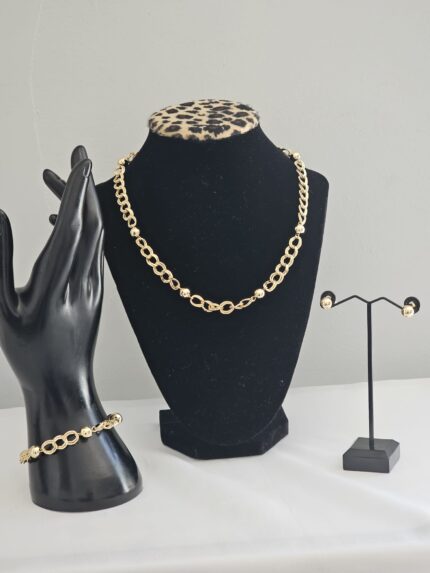 The Golden Sphere Elegance Necklace showcases a refined design crafted from gold-plated stainless steel. The Golden Sphere Elegance Earrings are short, delicate gold dangles that elegantly complement the necklace. The Golden Sphere Bracelet perfectly complements the necklace with its refined design. Made from the same gold-plated stainless steel, it features a series of spherical elements mixed with smooth chain segments.