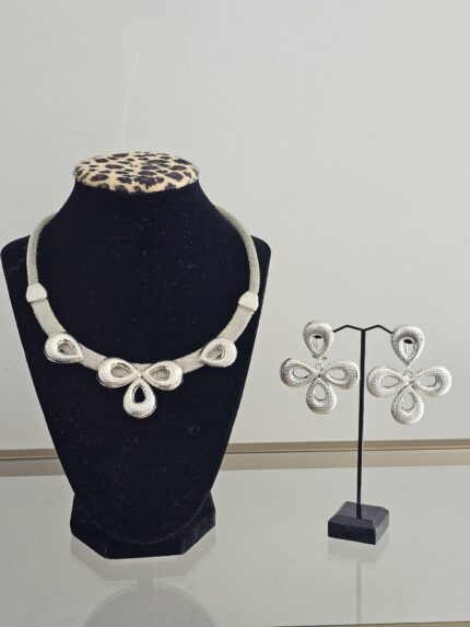 The Modern Elegance Necklace Set is a striking collection that exudes contemporary sophistication. Crafted in sterling silver, this set includes a necklace, earrings, bracelet, and ring, all featuring a unique textured design with geometric square accents. The interplay of smooth, polished silver and the angular square shapes creates a perfect balance of modern chic and understated elegance, making it a versatile addition to any jewelry collection.