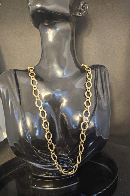 The "Eternal Link" Necklace is a stunning 24-inch piece that exudes sophistication and strength, capturing the essence of timeless elegance with a modern twist. Crafted in a rich, lustrous gold color, this necklace features an intricate design of interlinked chains that flow seamlessly together, creating a bold yet graceful silhouette. The links, each delicately shaped and perfectly connected, allow the necklace to drape beautifully across the neckline, creating a fluid and dynamic movement that catches the light with every turn.