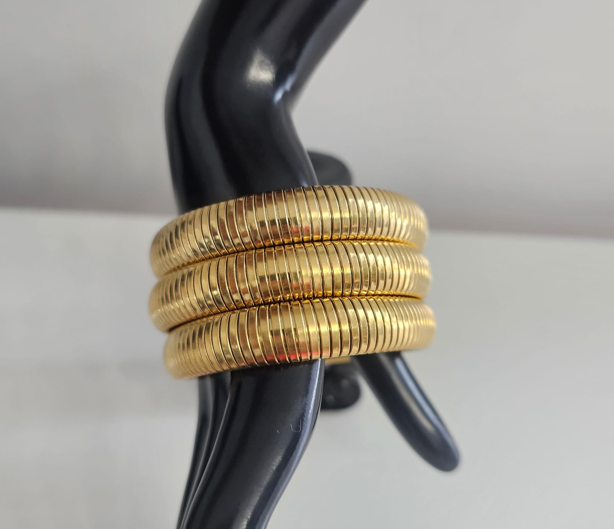 This 3 in 1 non-tarnish, gold plated three toned elastic bracelet is a versatile accessory that combines three different styles or colors into one stretchy, comfortable band.