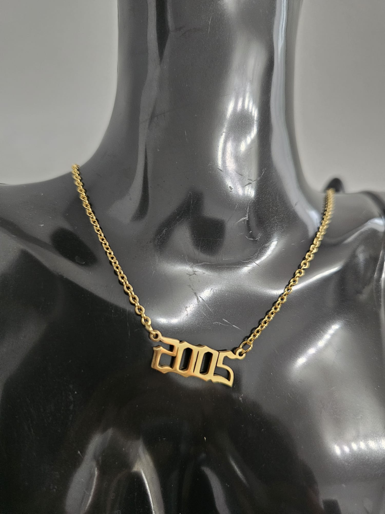 The “2005 Stainless Steel Gold Necklace” is a striking piece that combines durability with elegance. This necklace features the year “2005” as its pendant, crafted in bold block numbers.