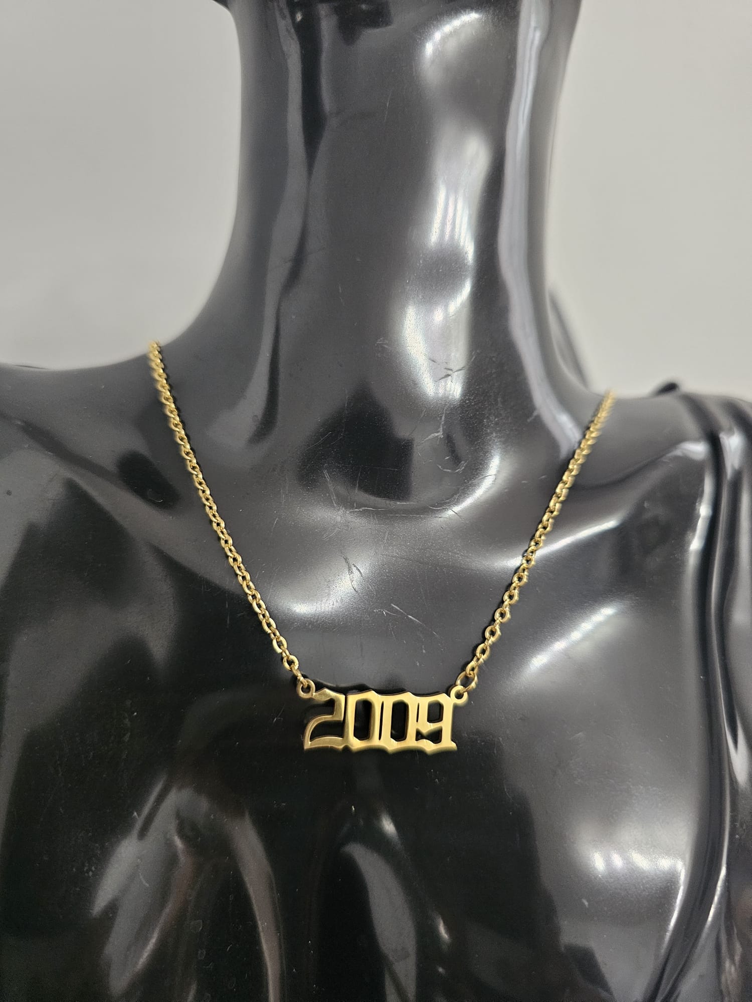 The “2009 Stainless Steel Gold Necklace” is a striking piece that combines durability with elegance. This necklace features the year “2009” as its pendant, crafted in bold block numbers.