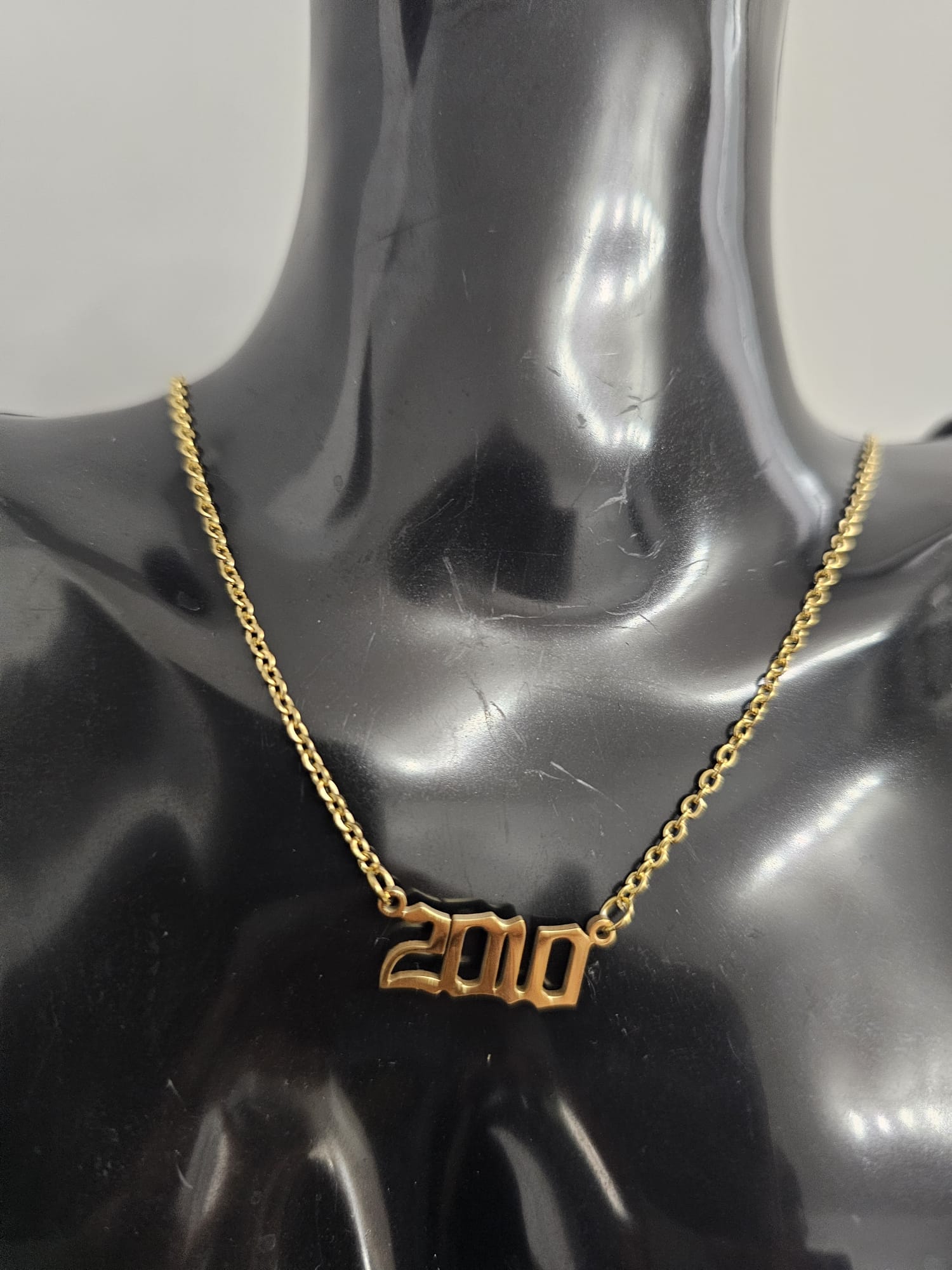 The “2010 Stainless Steel Gold Necklace” is a striking piece that combines durability with elegance. This necklace features the year “2010” as its pendant, crafted in bold block numbers.