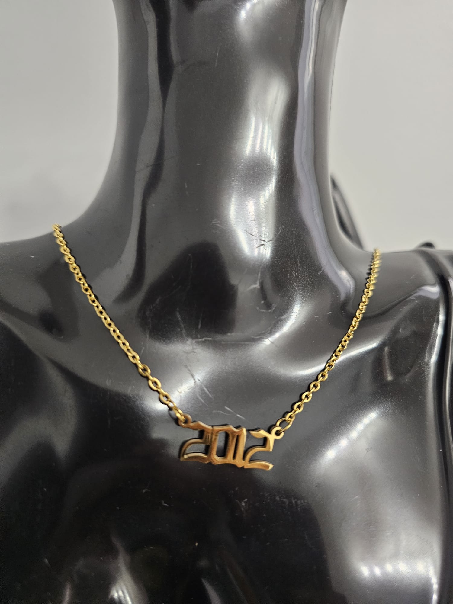 The “2012 Stainless Steel Gold Necklace” is a striking piece that combines durability with elegance. This necklace features the year “2012” as its pendant, crafted in bold block numbers.