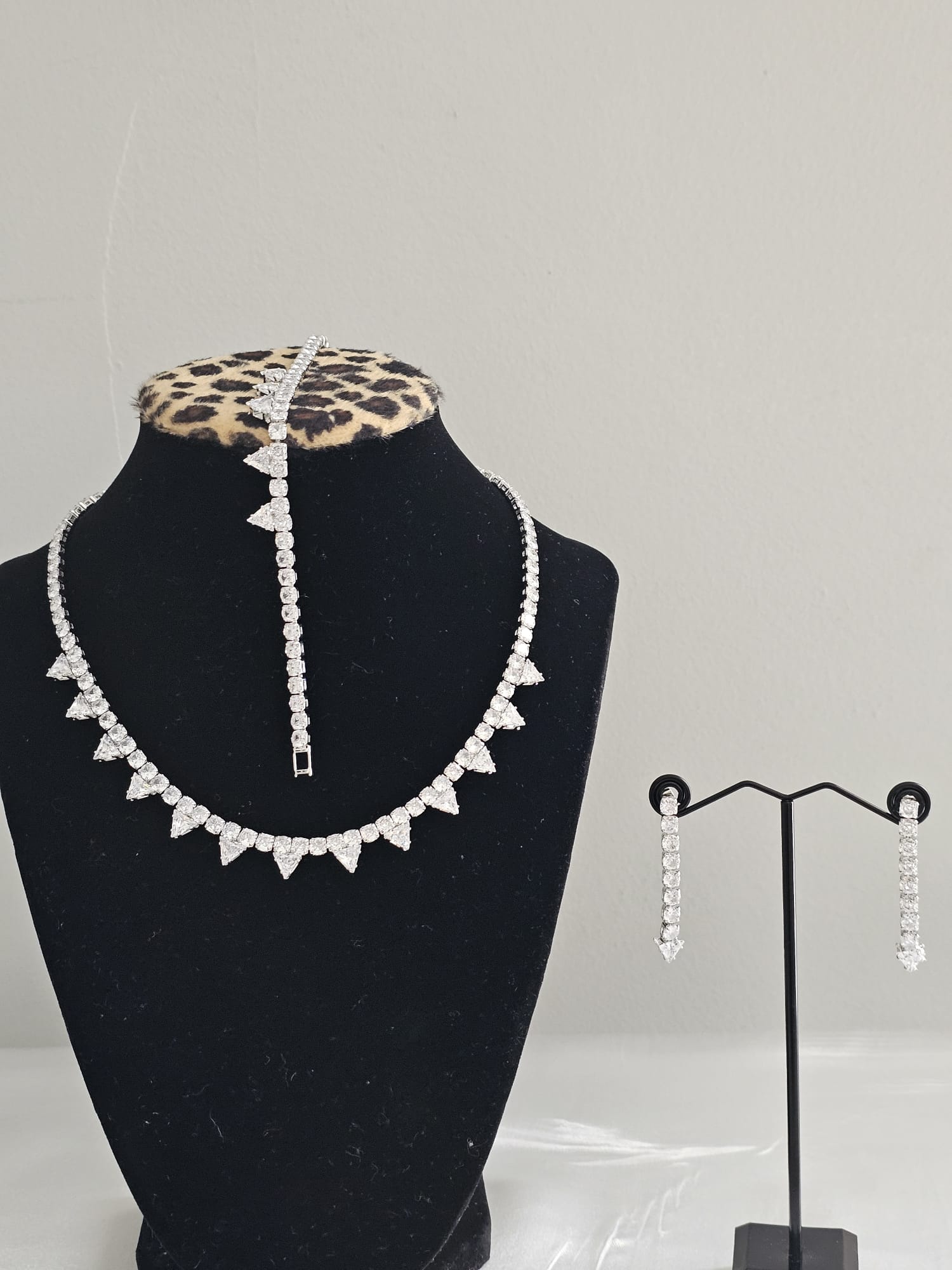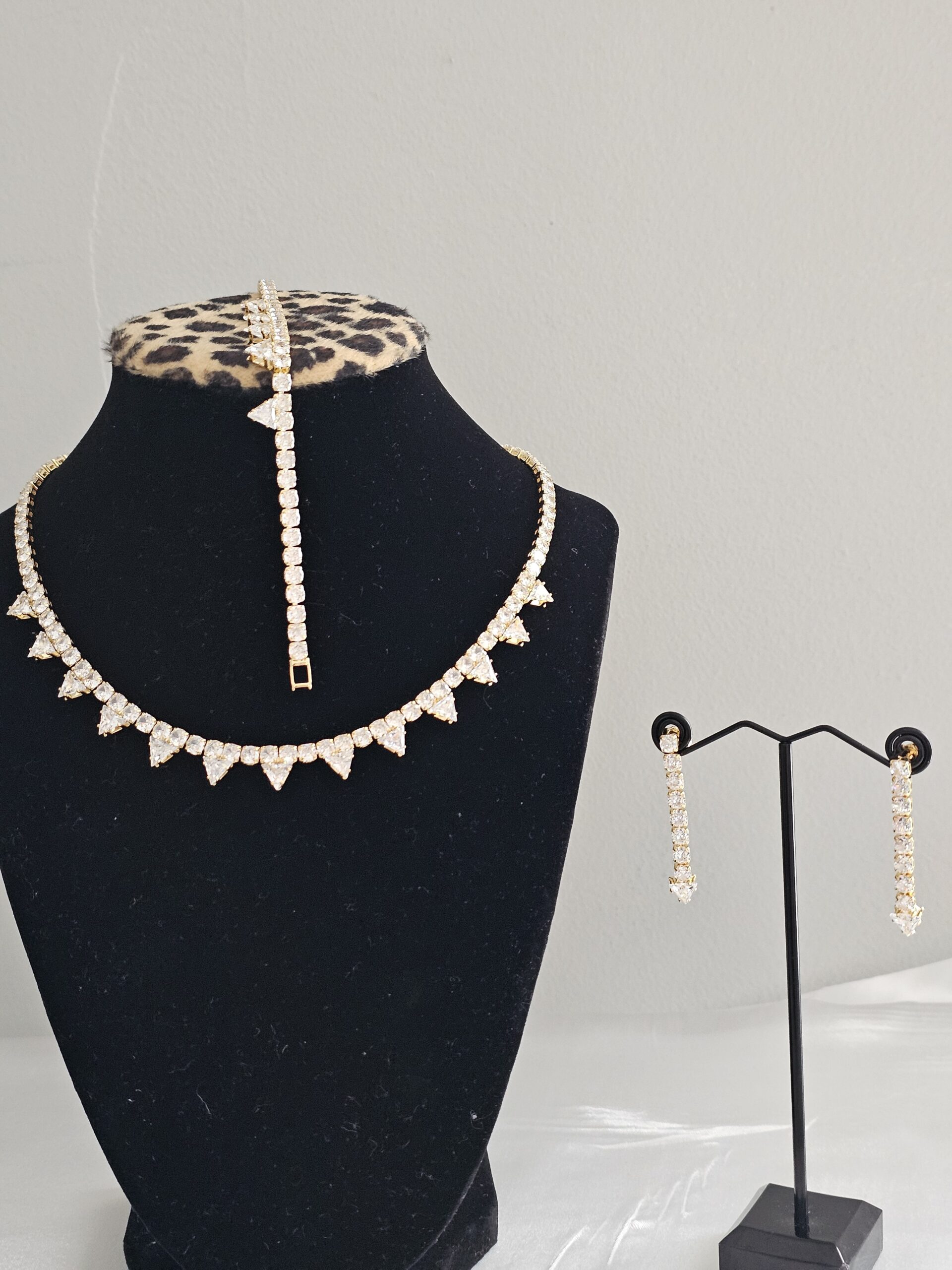 This 3 in 1 dainty set is a charming and versatile jewelry collection designed to add a touch of elegance to any outfit. This set includes three coordinated pieces; a necklace, bracelet, and pair of earrings, all featuring delicate and minimalist designs. Each piece is crafted with fine details, featuring small gemstones and stainless steel.