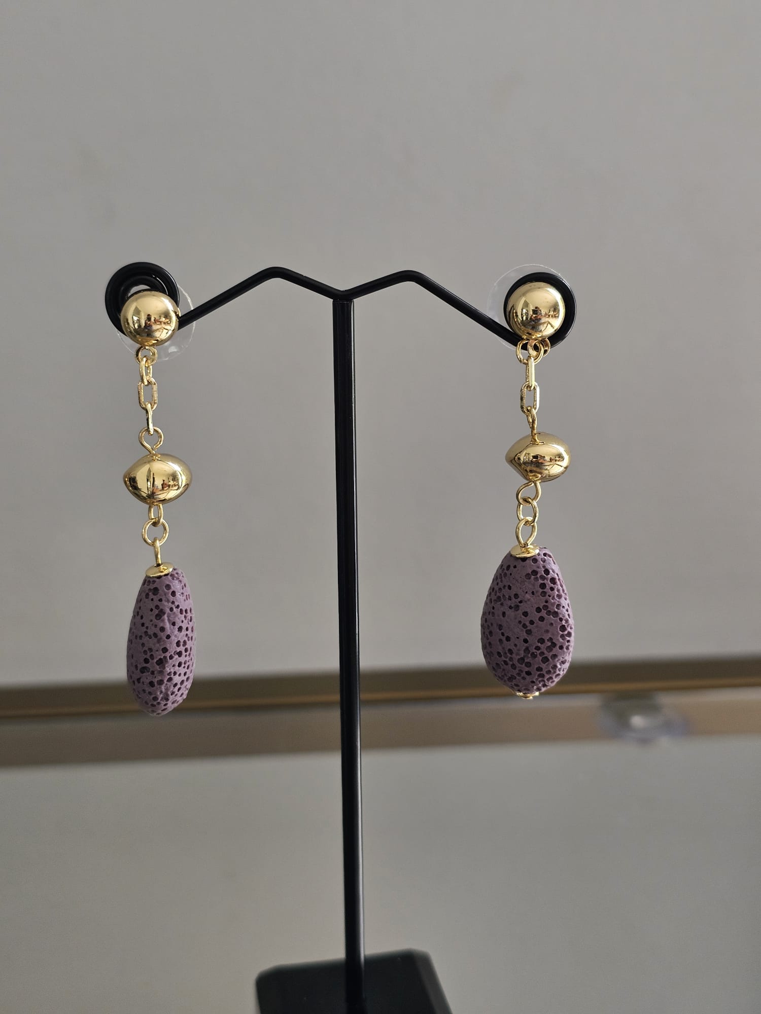 Suspended from each earring is a beautiful amethyst gemstone, adding a touch of color and sophistication. The amethyst is carefully selected for its rich purple hue and is securely set to dangle gracefully, catching the light with every movement. The combination of the warm gold and the cool purple creates a striking contrast that is both elegant and eye-catching.