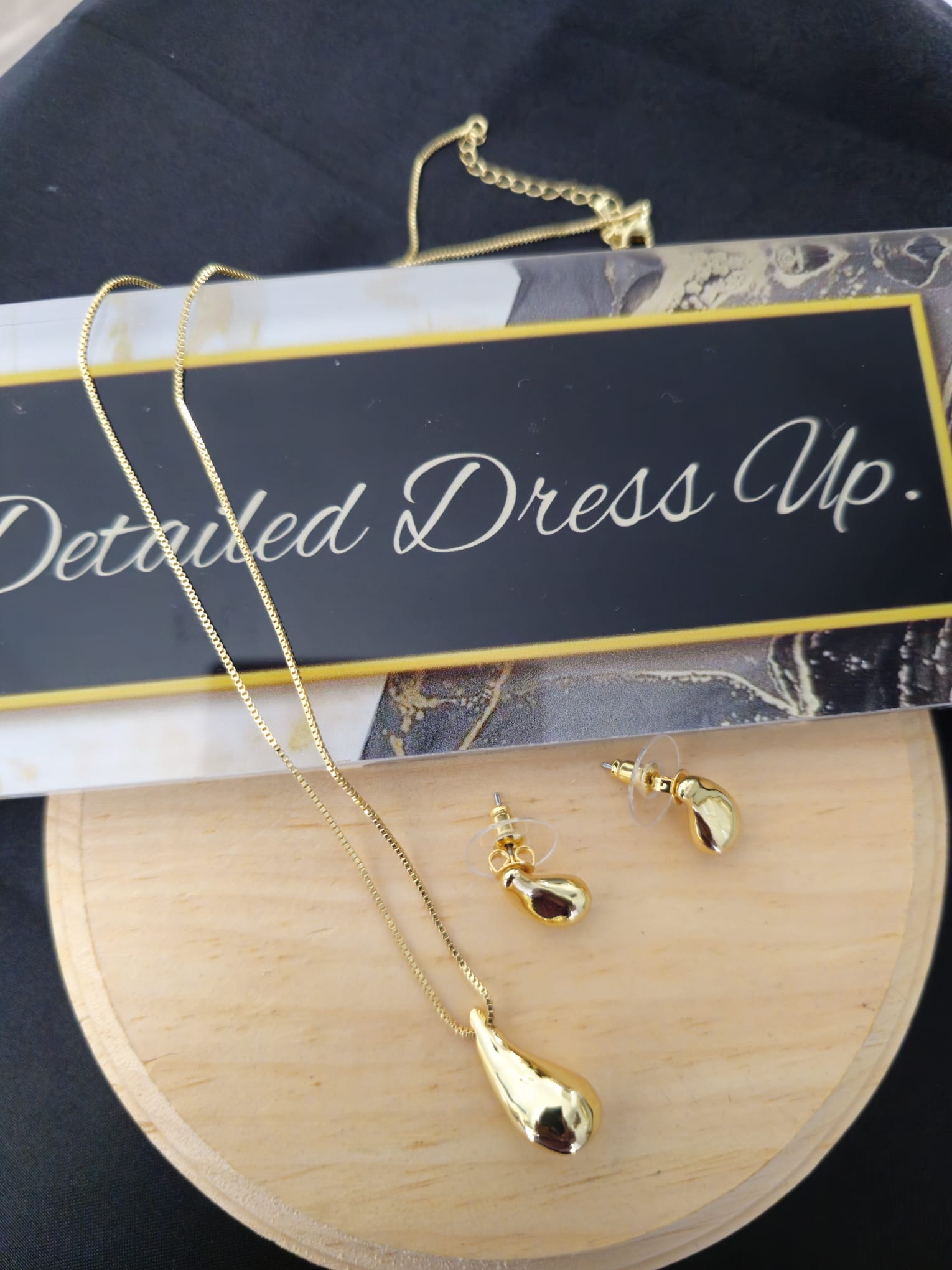 Earrings: The matching earrings echo the necklace’s theme with their own teardrop design. Each earring features a gold-plated droplet that mirrors the pendant’s shape and shine. The earrings are designed for comfort and elegance, with secure backings to ensure a perfect fit.