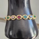 The Aurora Radiance Bracelet is a dazzling accessory that seamlessly blends vibrant colors with elegant design. Crafted from gold-plated stainless steel, this bracelet features a central display of assorted faux gemstones, each carefully chosen for their rich hues and brilliant sparkle.