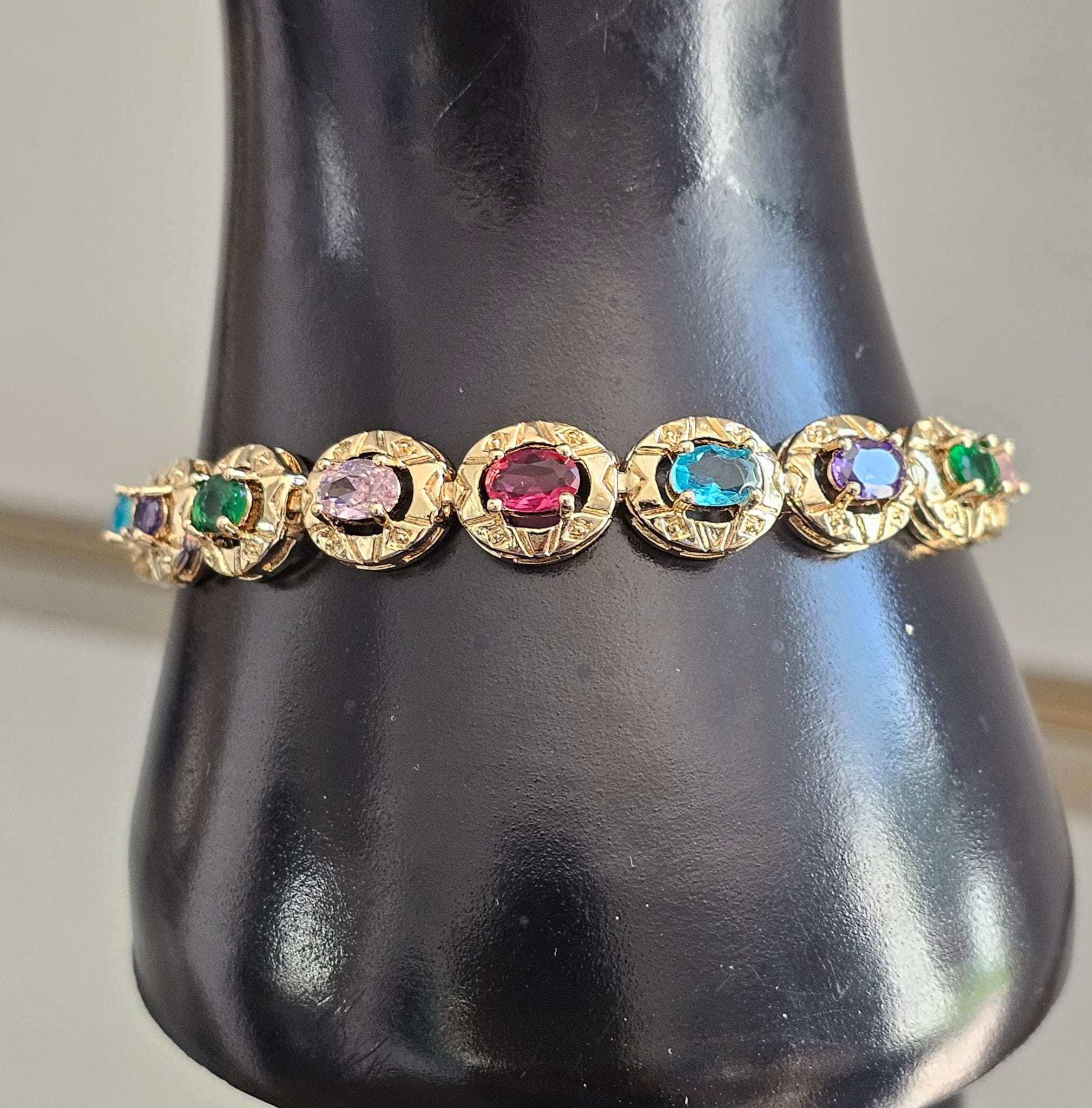 The Aurora Radiance Bracelet is a dazzling accessory that seamlessly blends vibrant colors with elegant design. Crafted from gold-plated stainless steel, this bracelet features a central display of assorted faux gemstones, each carefully chosen for their rich hues and brilliant sparkle. These simulated gems are arranged in a captivating pattern, creating a vibrant mosaic that captures the eye.