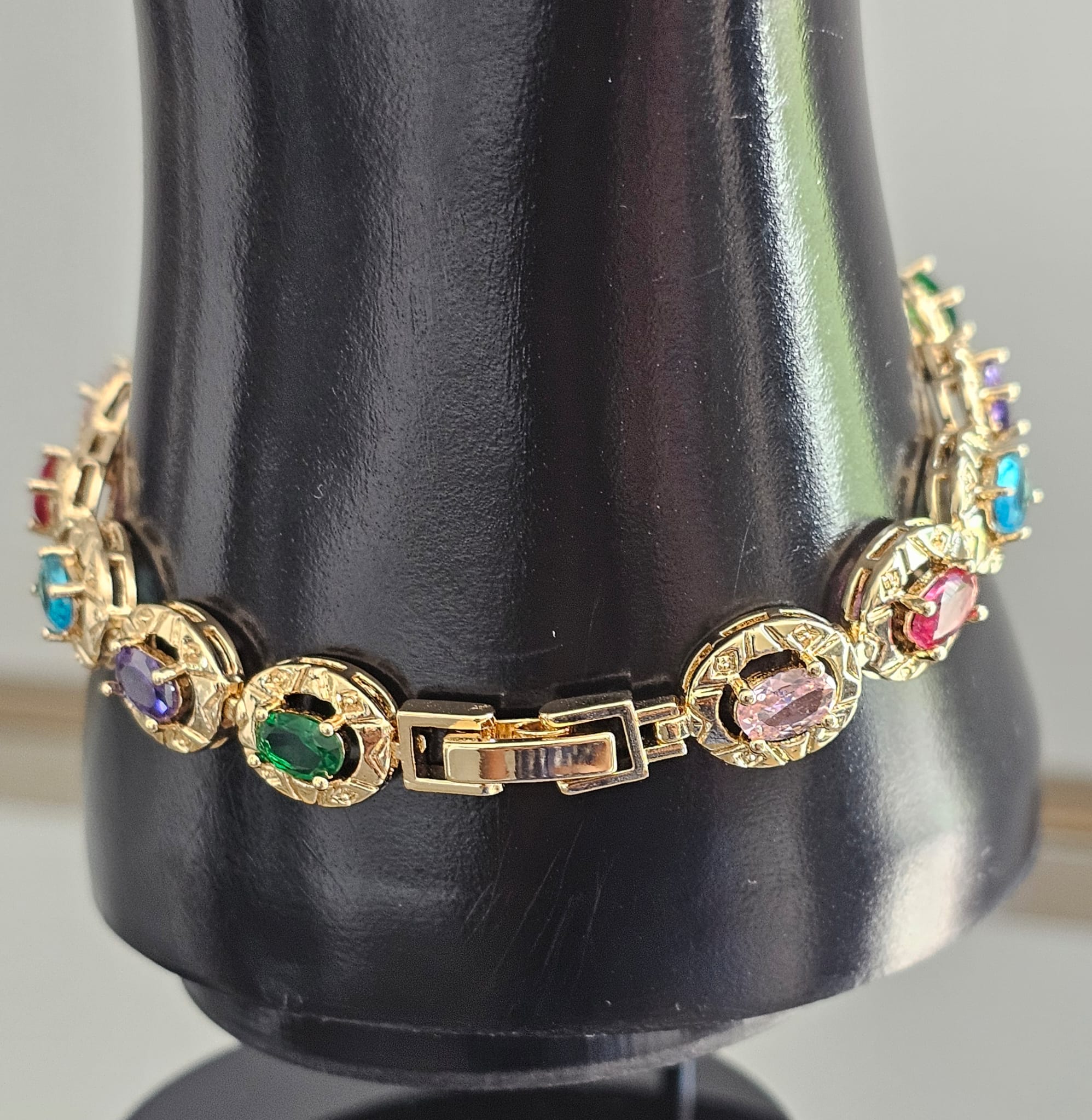 The centerpiece is encircled by a smooth, gold-plated stainless steel oval rim, which highlights and frames the colorful array of gemstones with a polished, refined finish. The gold plating adds a luxurious touch, enhancing the overall sophistication of the bracelet. The stainless steel base ensures durability and a long-lasting shine, while the combination of faux gemstones and gold plating delivers a striking, high-fashion look. The Aurora Radiance Bracelet is perfect for adding a splash of color and elegance to any ensemble.