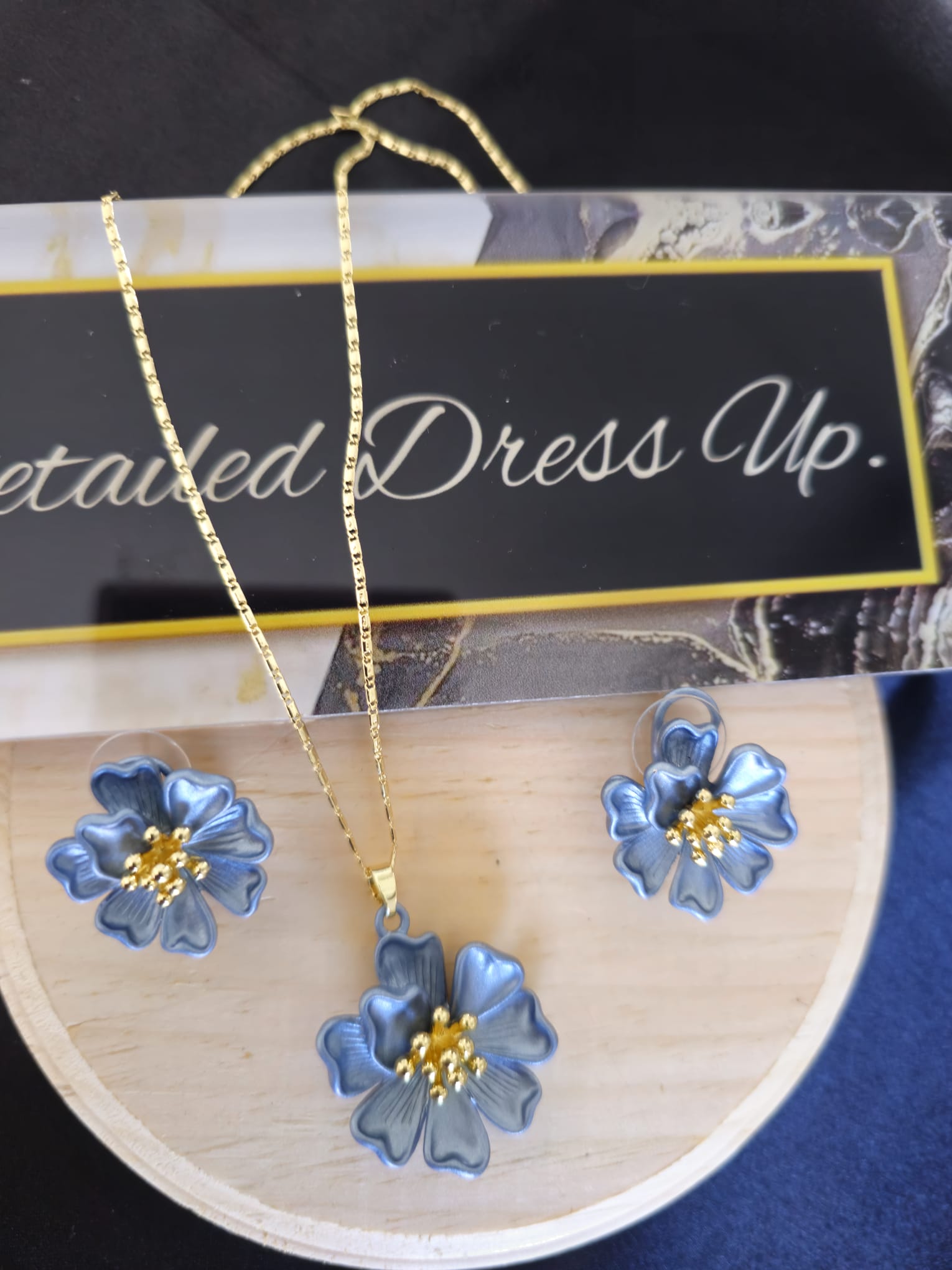 The Azure Blossom Set features a sophisticated and elegant design crafted from gold-plated non-tarnish stainless steel. The necklace showcases a delicately designed blue flower pendant, with its petals adorned in a rich blue hue, while the center of the flower is highlighted with a touch of luxurious gold. The pendant hangs gracefully from a sleek gold chain that complements the flower’s design without overpowering it.