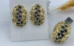 Azure Elegance features a stunning design with rectangular gold-plated frames that are intricately textured to catch the light beautifully. Each rectangle is adorned with tiny blue gemstones that add a touch of sparkle and sophistication.