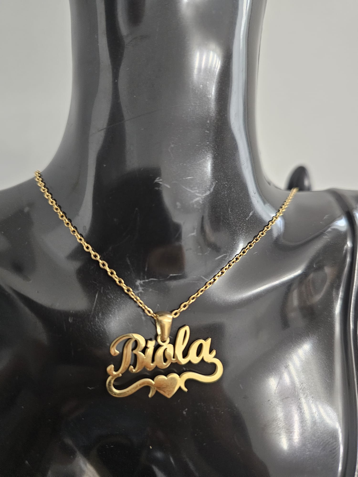 Introducing the “Biola” Stainless Steel Gold Necklace, a stunning piece that combines timeless beauty with personal significance. This necklace features a gold-plated, non-tarnish nameplate that proudly displays the name “Biola” in a cursive, flowing script, with a heart at the bottom.