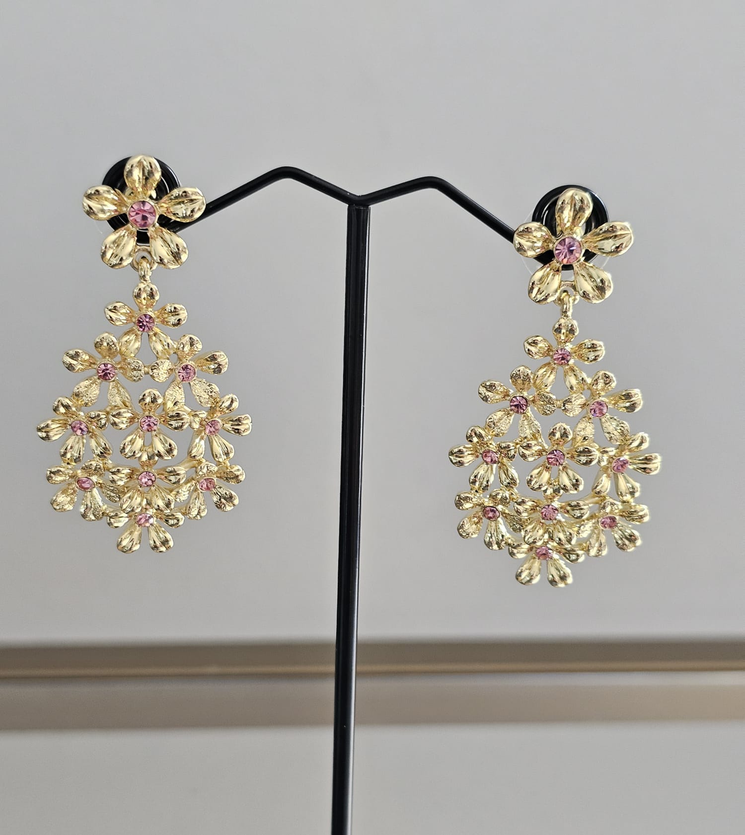 Each flower within the teardrop is adorned with a sparkling pink stone at its center, adding a touch of vibrant color and brilliance. The contrast between the warm gold and the soft pink stones creates a harmonious and eye-catching effect. The floral design, combined with the teardrop shape, evokes a sense of natural beauty and elegance, making this earring a perfect statement piece for any occasion.