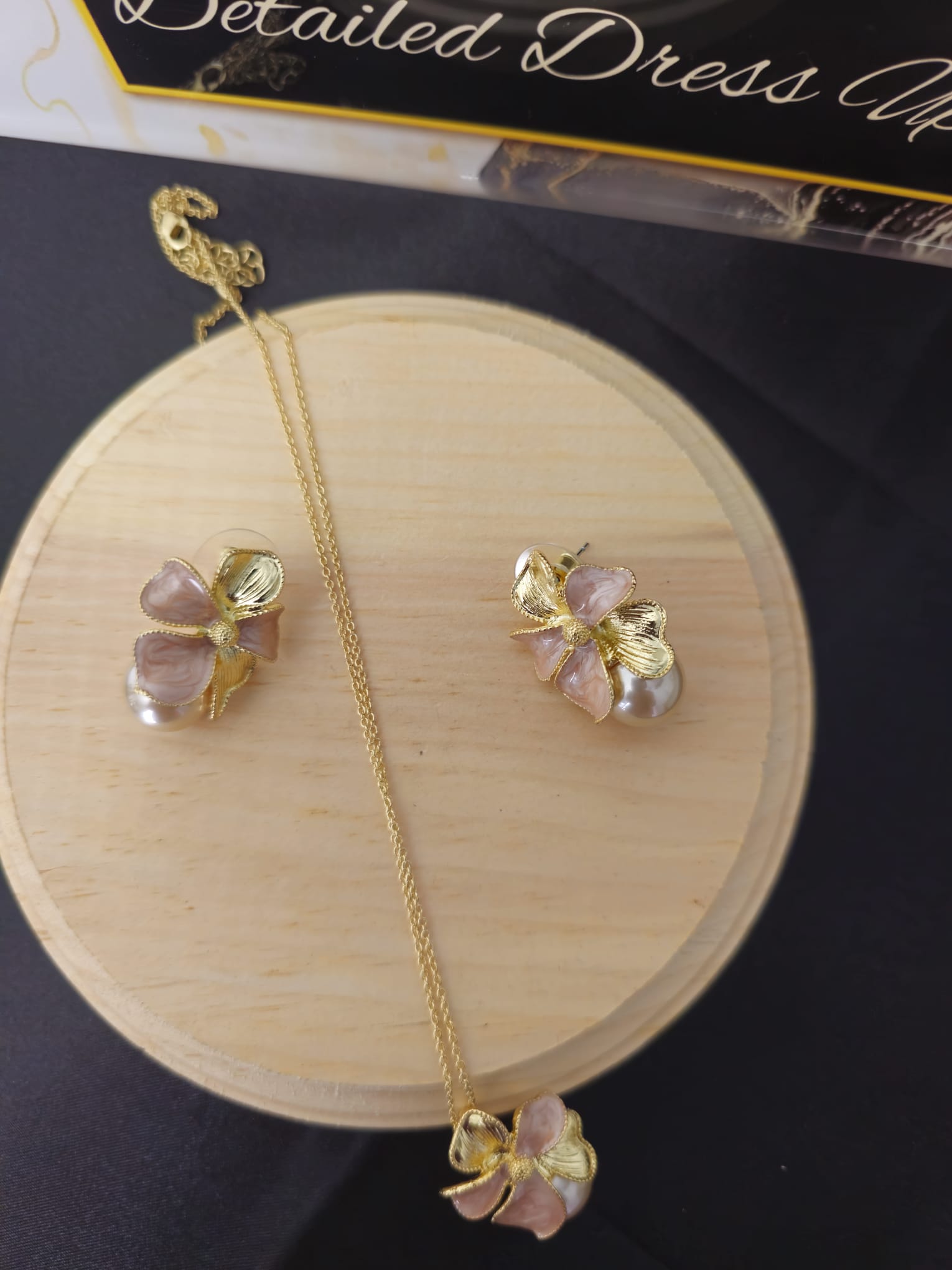 The necklace features a graceful flower pendant with soft pink petals, artfully detailed to capture its natural beauty. The flower is outlined and accented with luxurious gold, which highlights its intricate design and adds a touch of warmth and elegance.The matching earrings each showcase a smaller version of the pink flower, with the same gold accents. Nestled next to the flower on each earring is a lustrous faux pearl, adding a classic and refined element to the design. The pearl’s smooth, iridescent surface contrasts beautifully with the pink and gold, creating a balanced and harmonious look.