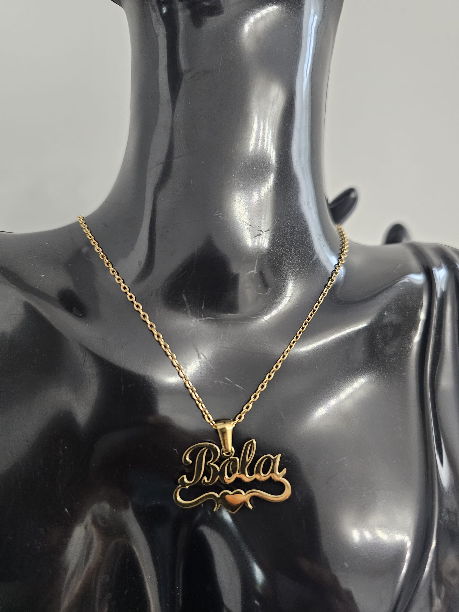 Introducing the “Bola” Stainless Steel Gold Necklace, a stunning piece that combines timeless beauty with personal significance. This necklace features a gold-plated, non-tarnish nameplate that proudly displays the name “Bola” in a cursive, flowing script, with a heart at the bottom.