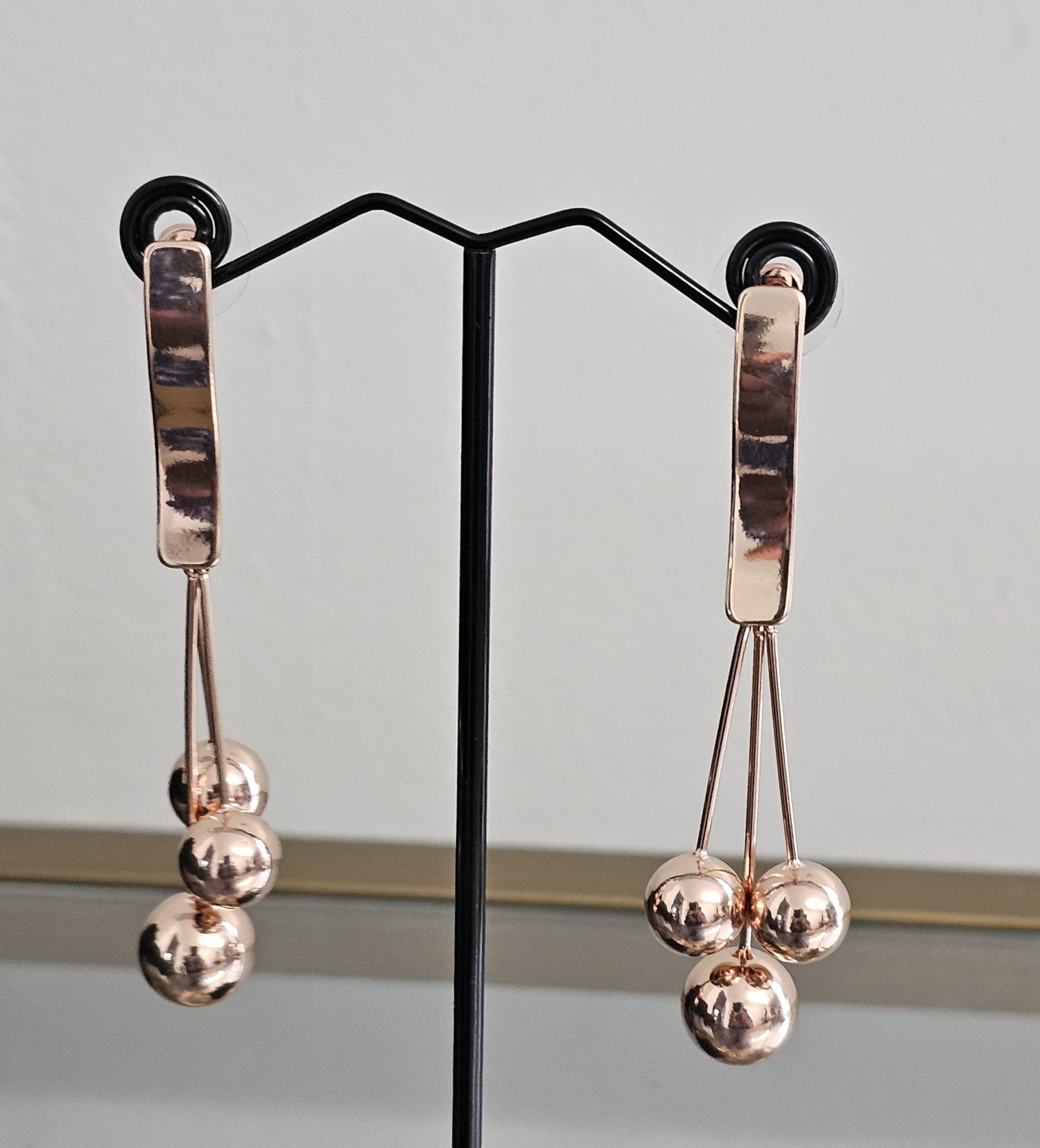 Each earring features a sleek, dangling design that culminates in three perfectly spherical bronze balls. These balls are arranged in descending size, creating a balanced and harmonious look. The top ball is the largest, followed by a medium-sized ball, and finally, a smaller ball at the bottom. This arrangement adds a touch of sophistication and movement to the earrings, making them a standout piece.