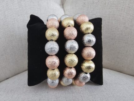 The Tri-Tone Sphere Bracelet is a striking and versatile accessory crafted with gold-plated stainless steel balls, designed to offer a bold and stylish statement. This bracelet features a dynamic combination of gold, silver, and bronze spheres, strung together on a flexible elastic band for a comfortable fit.