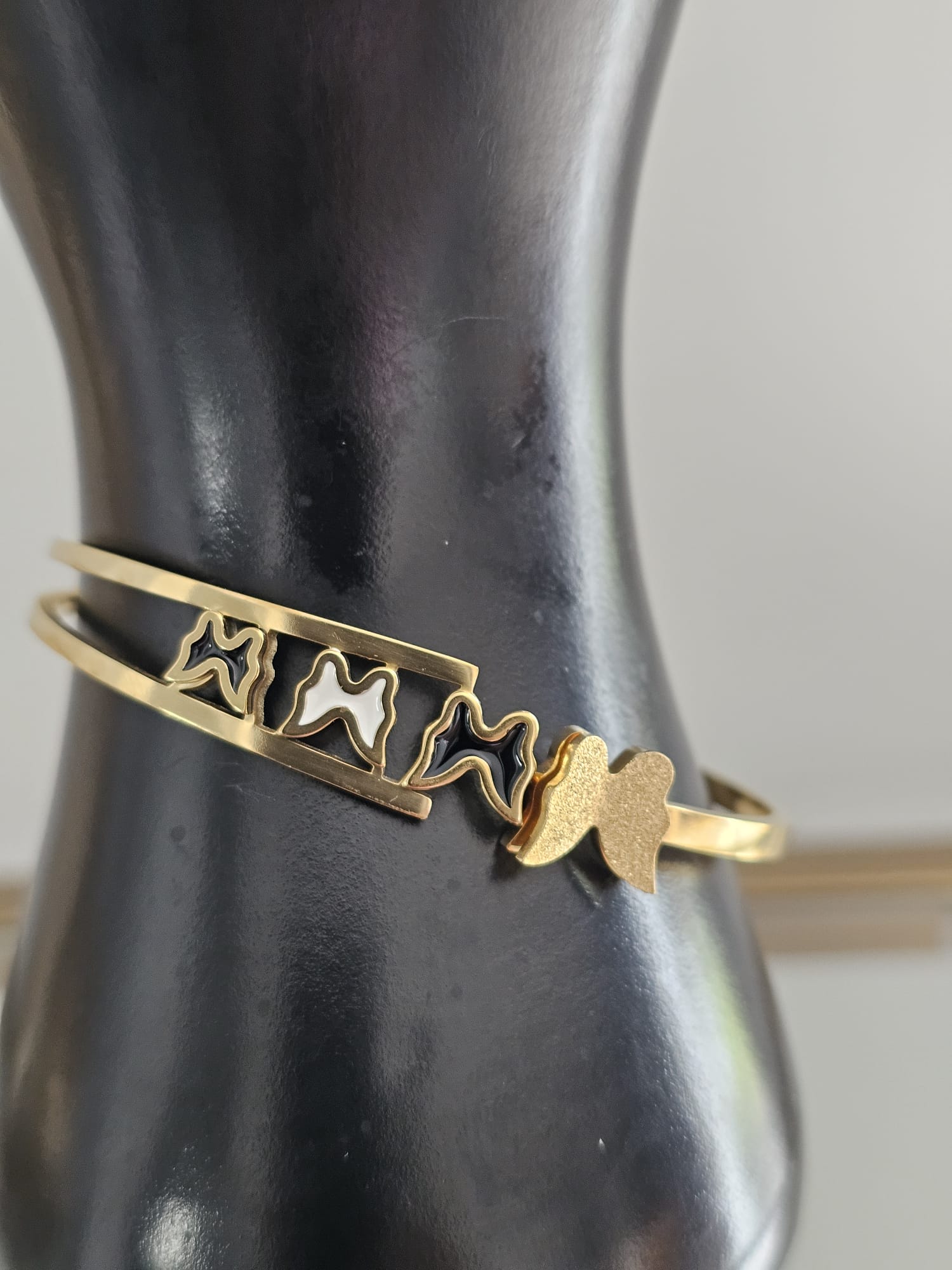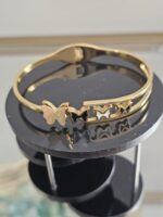 This elegant bracelet is named the “Butterfly Dreams Bracelet”. It features a double band design, crafted from a shiny, non-tarnish gold-plated material, ensuring durability and long-lasting wear. The centerpiece of this bracelet is a beautifully detailed butterfly with outstretched wings, adding a whimsical and sophisticated touch to the piece. The butterfly’s textured finish contrasts with the smooth bands, creating a sparkling effect that catches the light beautifully.