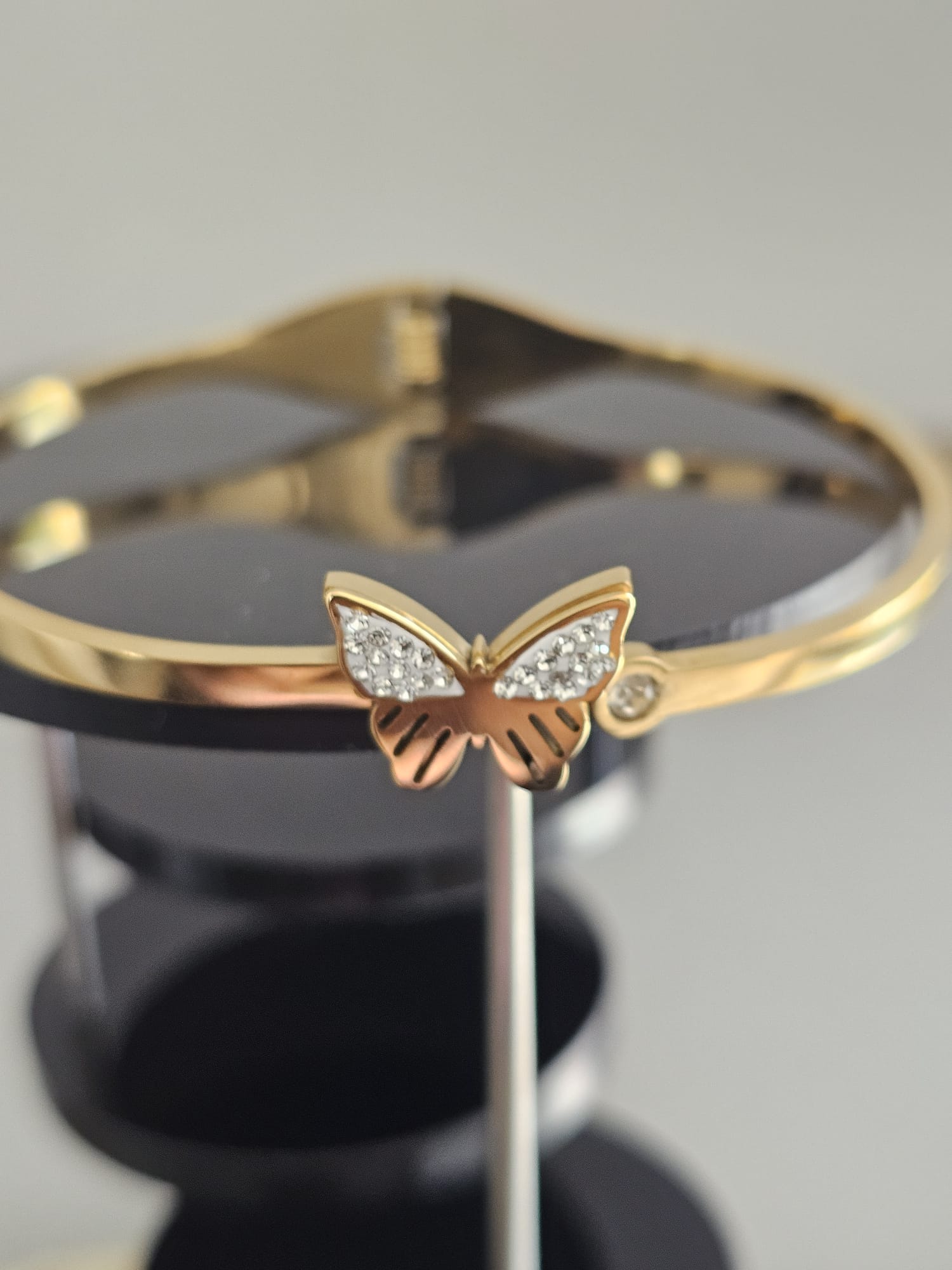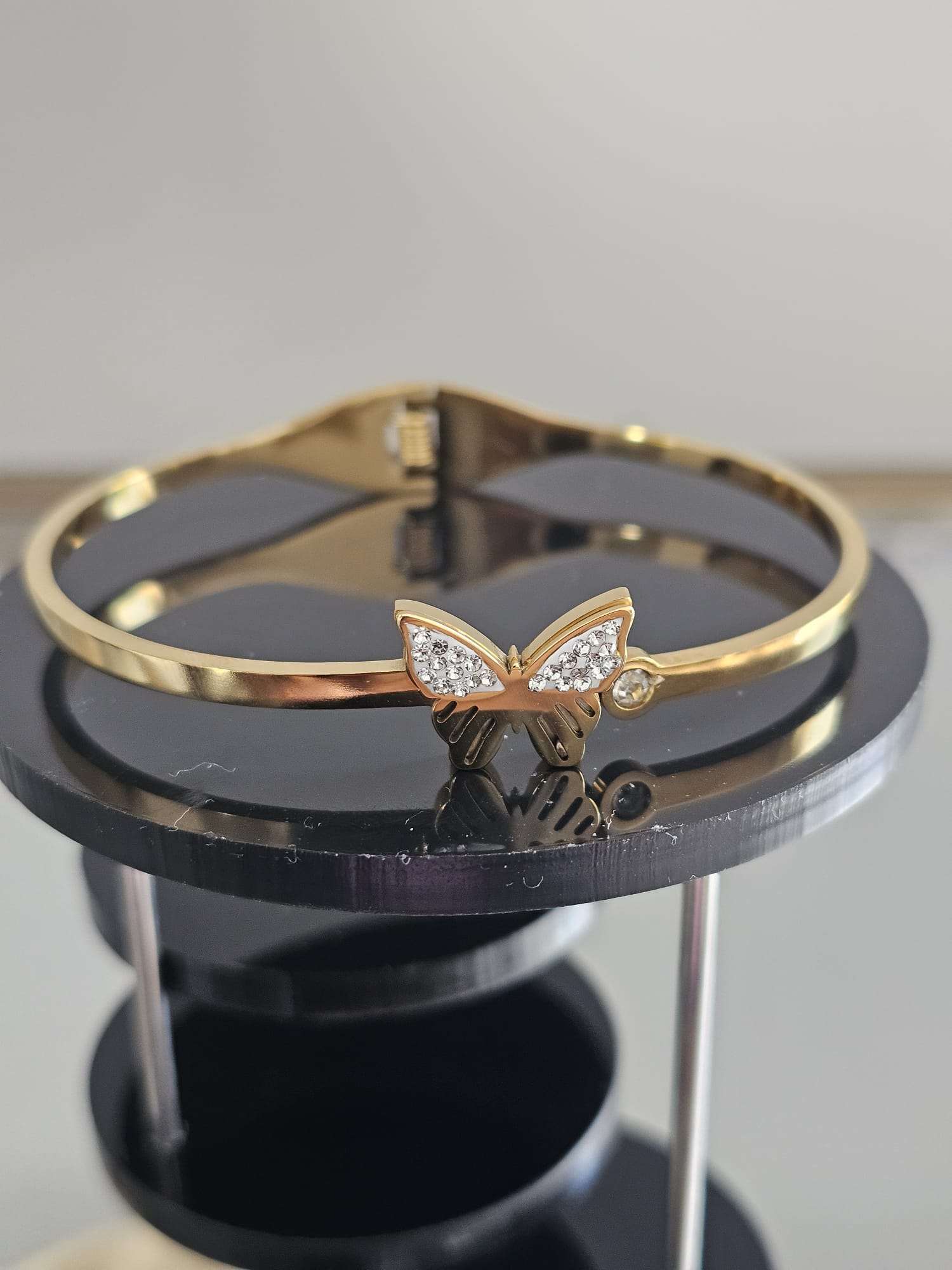 The “Butterfly Enchantment Bracelet” is a mesmerizing piece that captures the delicate beauty of nature. This bracelet features a sleek, polished gold-plated band that exudes elegance and sophistication. Its slender, bangle-style design allows it to slip effortlessly over the wrist, making it both stylish and easy to wear.