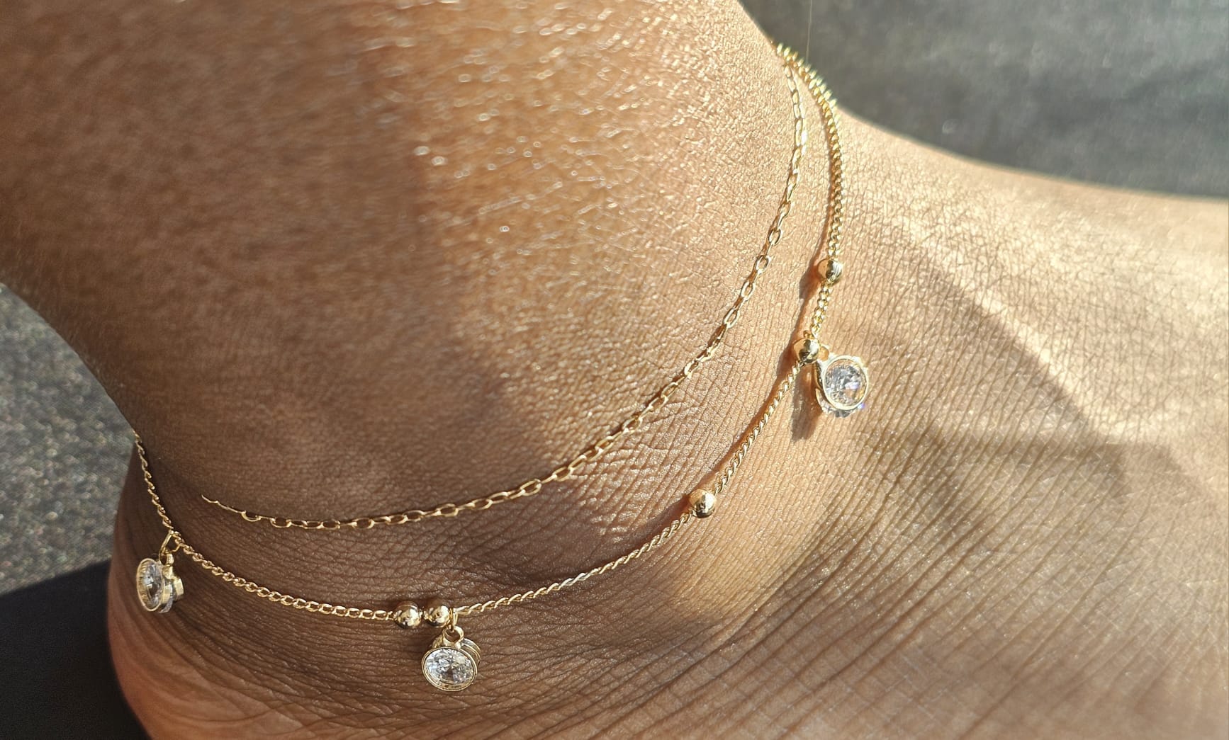 “Celestial Cascade” is a breathtaking gold anklet that features two delicate rows of gold-plated chains, adorned with shimmering silver stones scattered throughout. This exquisite piece is designed to evoke the beauty of a starry night, with each silver stone representing a twinkling star in the sky.