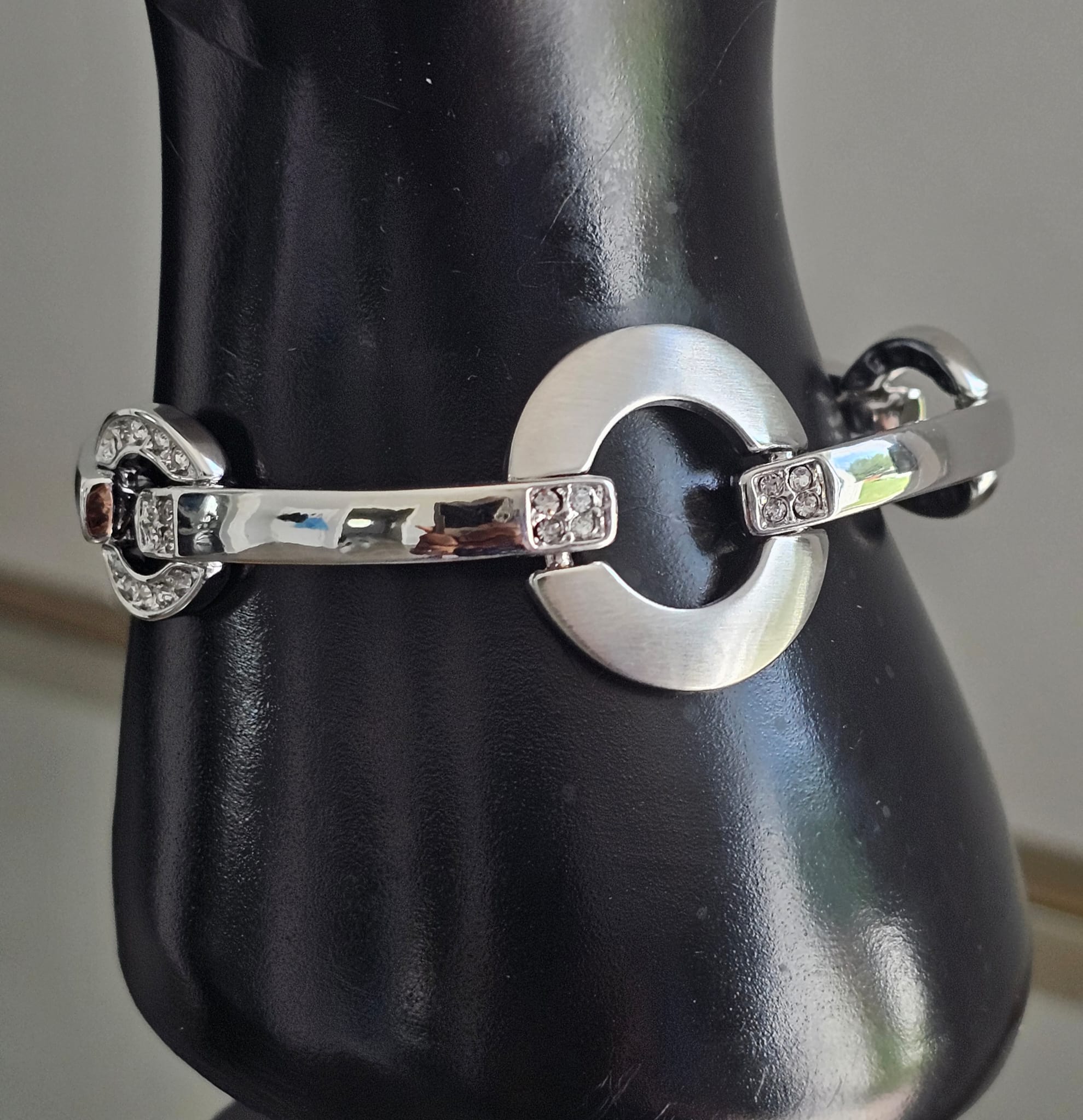 Flanking the central circle are two smaller silver bracelets, each adorned with a row of faux diamonds that add a touch of sparkle. These smaller bracelets are elegantly connected to the central circle by two thick, sleek strips of stainless steel, creating a seamless and refined linkage.