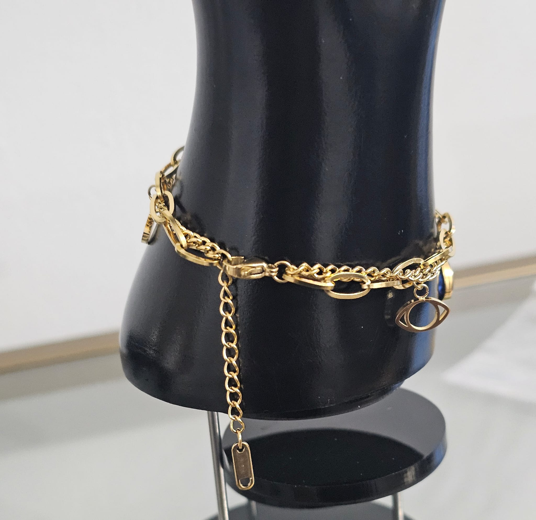 • Center Eye Charm: The central eye charm stands out with its exquisite design, adorned with fake diamonds that enhance its allure and sparkle. The eye motif symbolizes protection and insight, adding a mystical element to the bracelet.