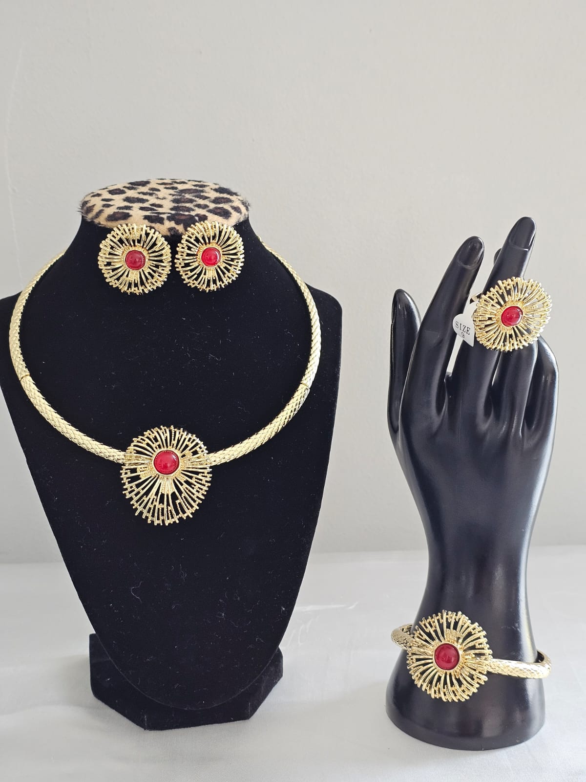 The Crimson Bloom Collection is a luxurious four-piece jewelry set crafted from gold-plated stainless steel, designed to offer a cohesive and elegant look. Size 9 ring.