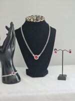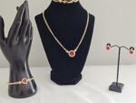 Bracelet: The Crimson Elegance Bracelet complements the necklace with a matching design. Made from non-tarnish stainless steel, it features a slender chain adorned with a central charm that showcases a faux red gemstone. The gemstone is set in a simple yet stylish bezel, highlighting its vivid hue. The bracelet’s adjustable clasp ensures a secure and comfortable fit, making it a chic accessory for both casual and formal occasions.
