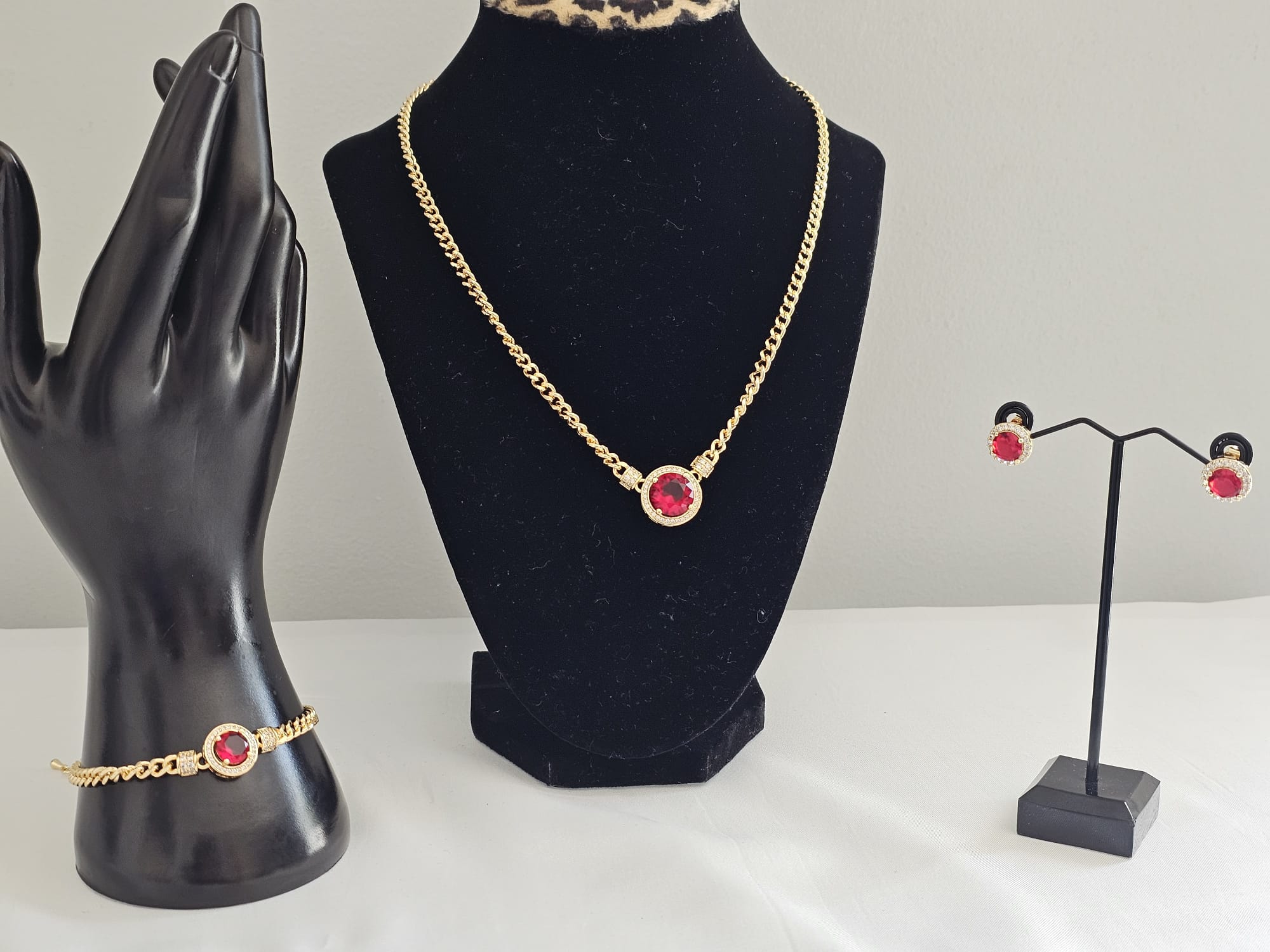 Earrings: The Crimson Elegance Earrings complete the set with their refined charm. Each earring features a short, drop design crafted from non-tarnish stainless steel, with a central faux red gemstone that adds a vibrant touch. The gemstones are set in a classic bezel setting that enhances their rich color and ensures they catch the light beautifully. These earrings provide a sophisticated complement to the necklace and bracelet, offering a cohesive and elegant look.