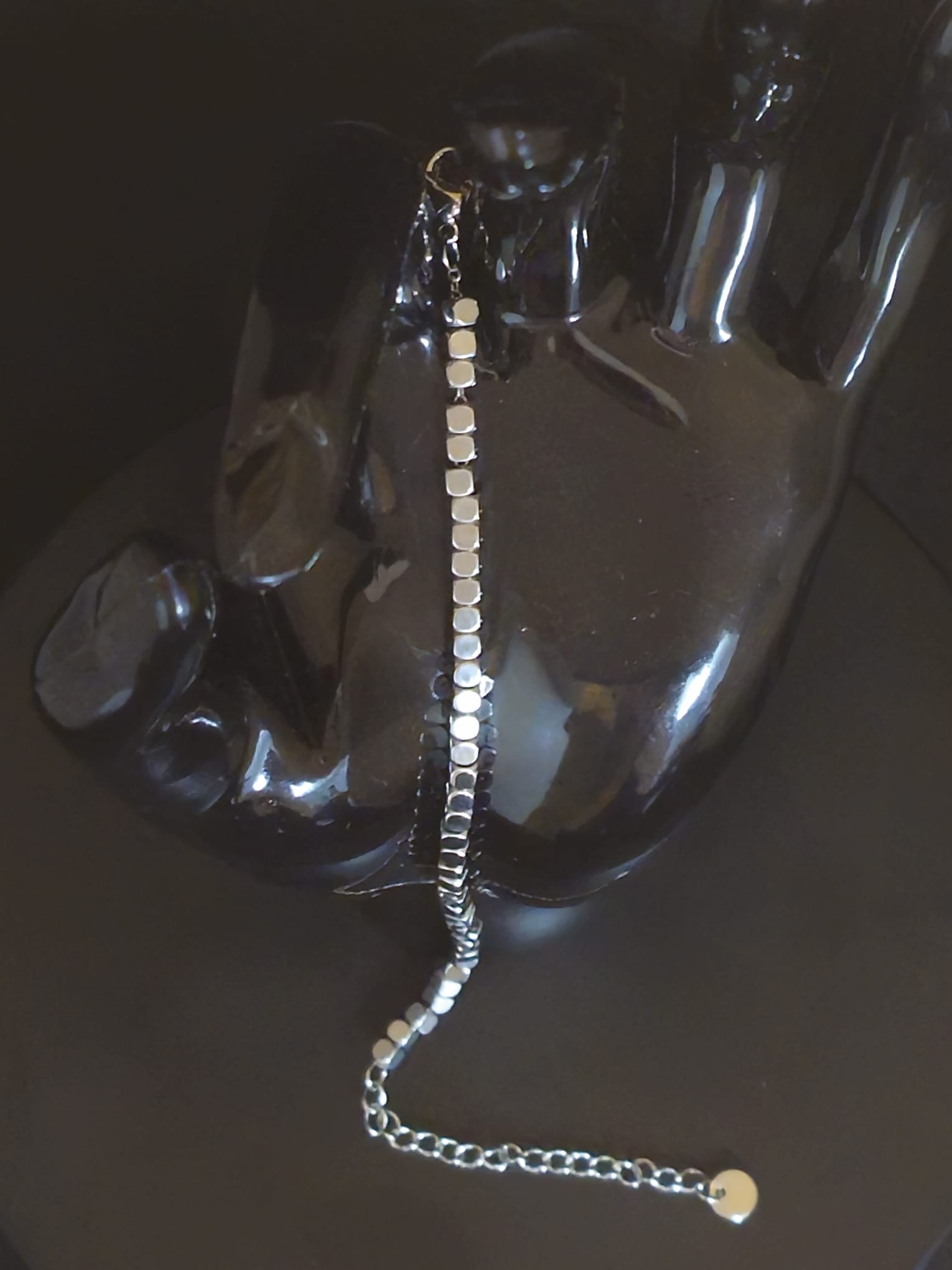 The stainless steel construction ensures durability and resistance to tarnish, while the polished surface reflects light beautifully, adding a subtle shimmer. The bracelet’s minimalist yet intricate design makes it a versatile accessory, suitable for both casual and formal occasions. With its clean lines and contemporary style, the Cube Link Elegance bracelet effortlessly combines sophistication with a touch of modernity.