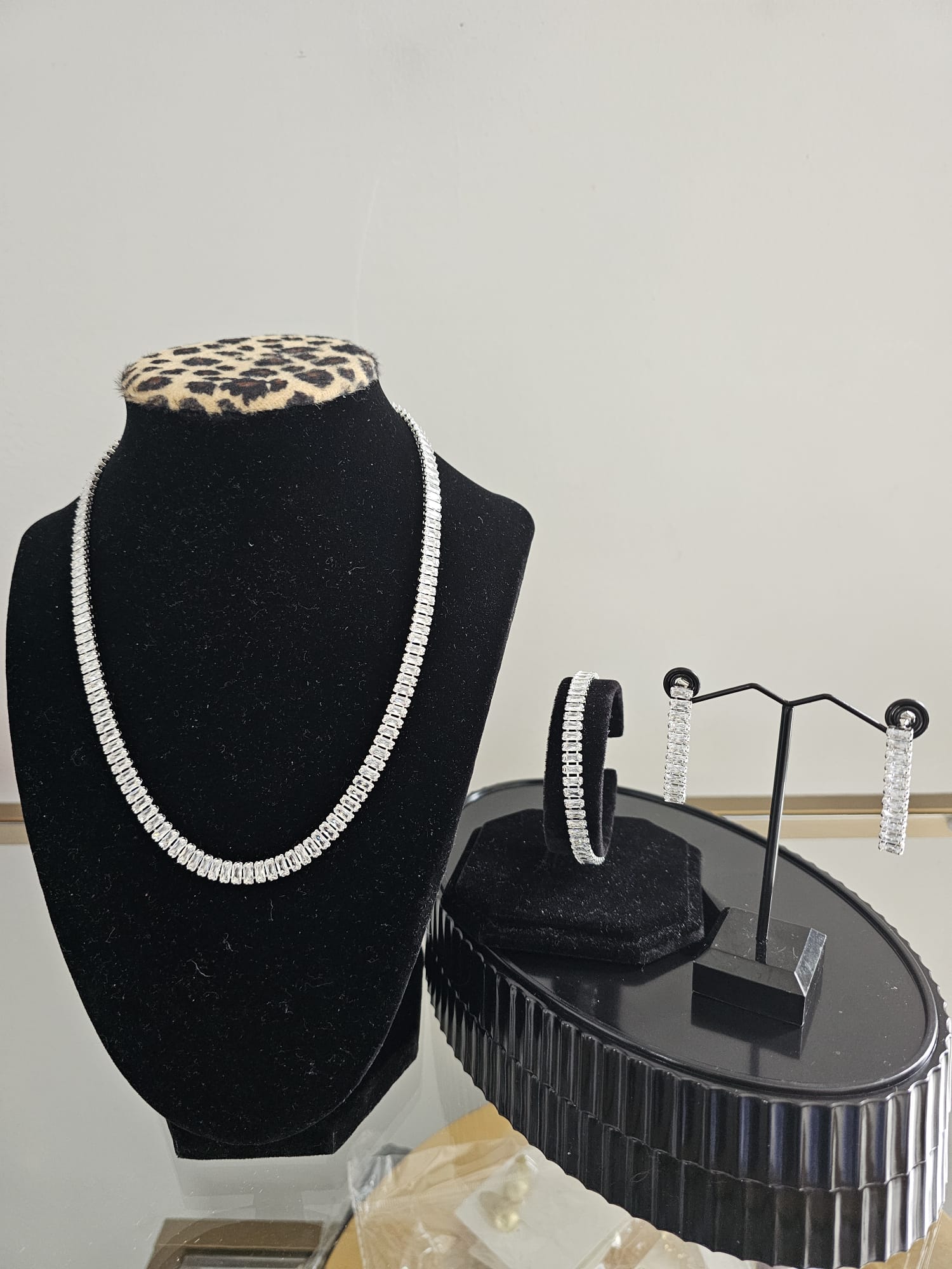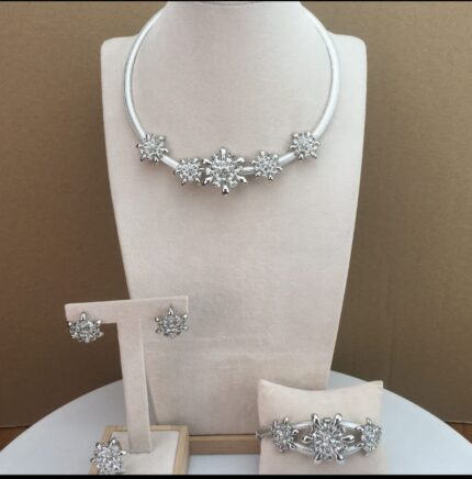 The Diamond Radiance Trio is an exquisite jewelry set crafted from high-quality stainless steel, designed to showcase luxurious sophistication with a focus on faux diamonds. The set includes a necklace, earrings, and a bracelet, each adorned with sparkling faux diamonds to create a cohesive and glamorous look.