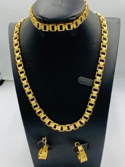 The Classic Link Trio is a sophisticated three-piece jewelry set crafted from gold-plated stainless steel, designed to provide a timeless and versatile aesthetic. This set includes earrings, a bracelet, and a necklace, each featuring a substantial, classy chain design that can be dressed up or down.