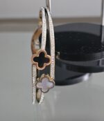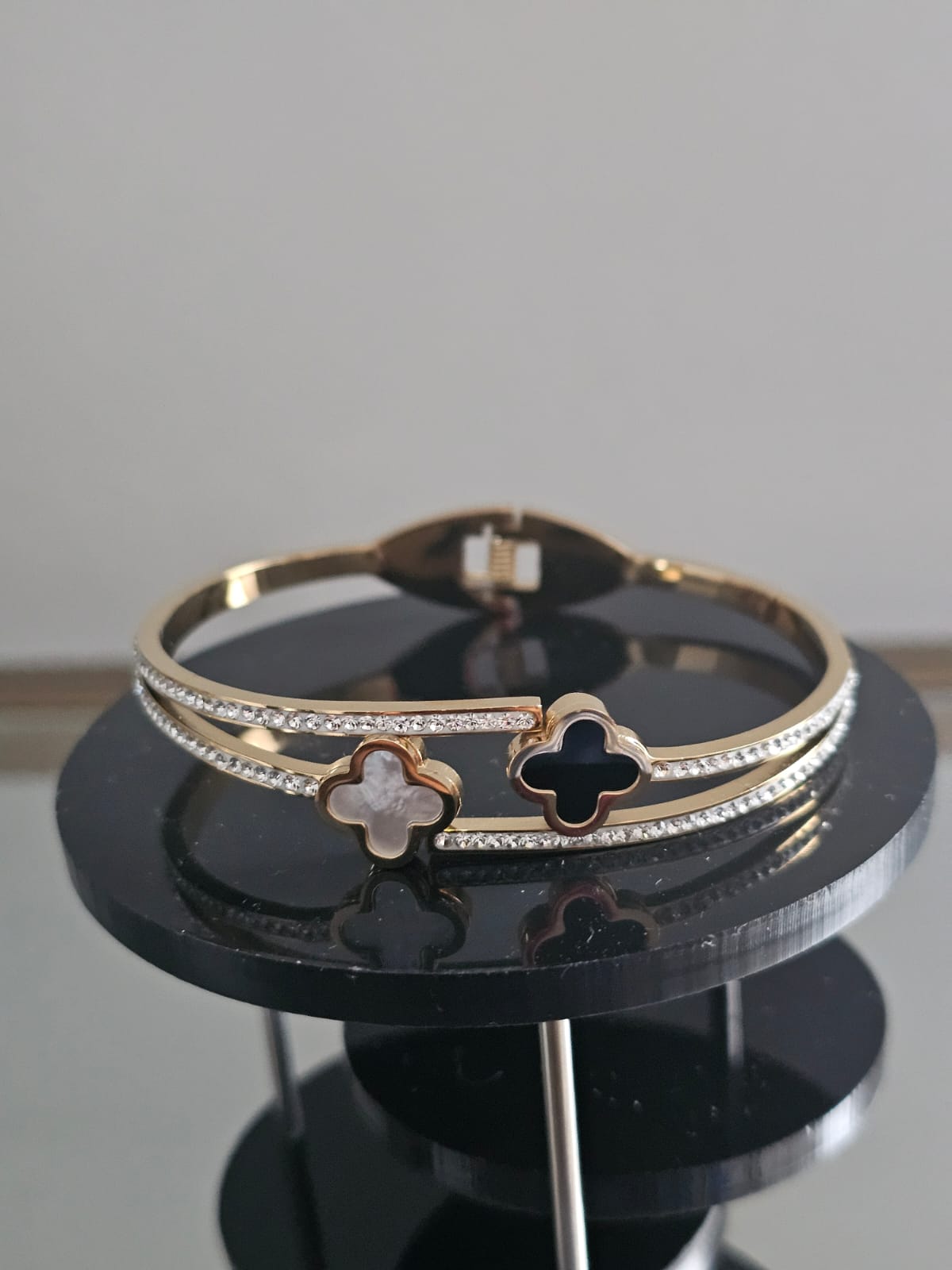 The Dual Elegance Bracelet is a sophisticated piece crafted from durable stainless steel, designed to offer both luxury and practicality. The bracelet features a distinctive two-layer design, with each layer elegantly adorned with faux diamonds. The top layer is embellished with a white clover motif, while the bottom layer showcases a complementary black clover, creating a striking contrast and enhancing the bracelet’s visual appeal. An easy-to-use clasp mechanism ensures that the bracelet can be securely fastened and effortlessly removed.