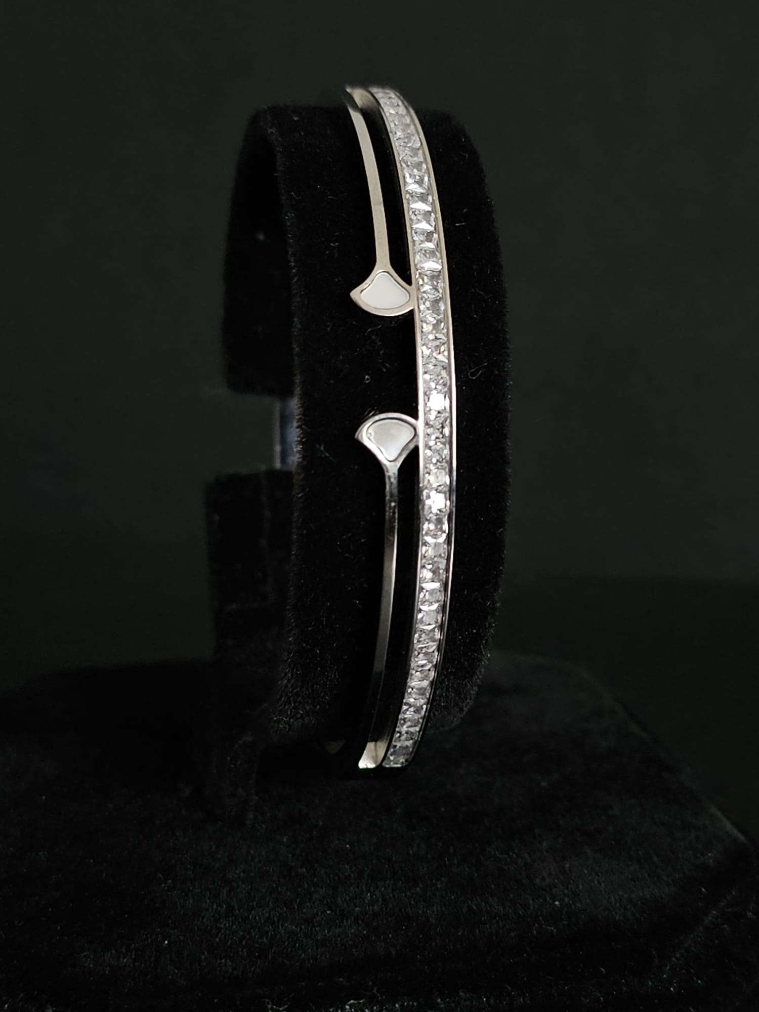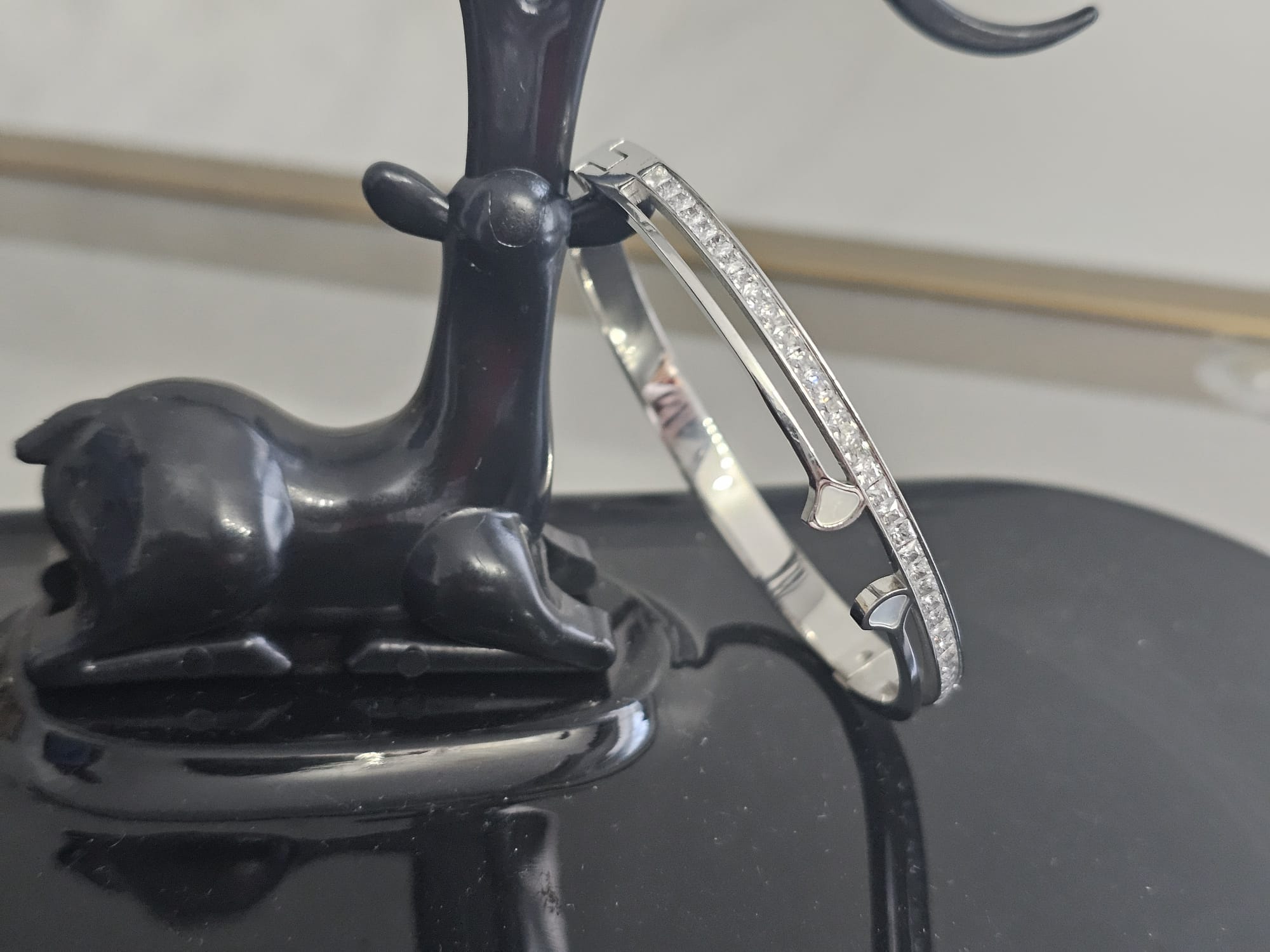 This Eclipse Duo Silver Bracelet is a sophisticated accessory crafted from high-quality stainless steel, blending elegance with contemporary design. This unique bracelet features two distinct layers that create a visually captivating effect. The first layer is embellished with a series of dazzling stones and the second layer has an open, semi-connected design that introduces a sense of modernity and lightness.