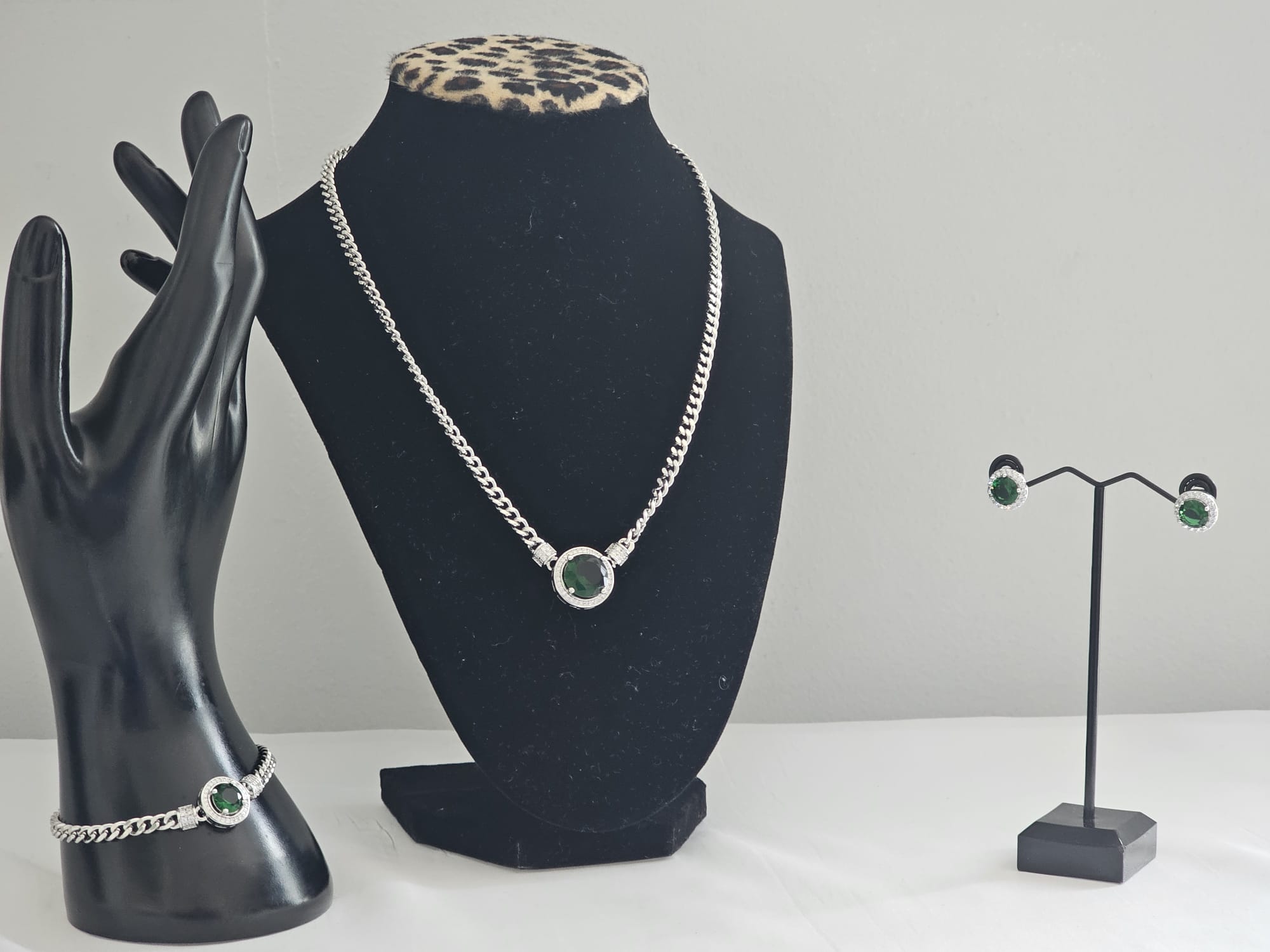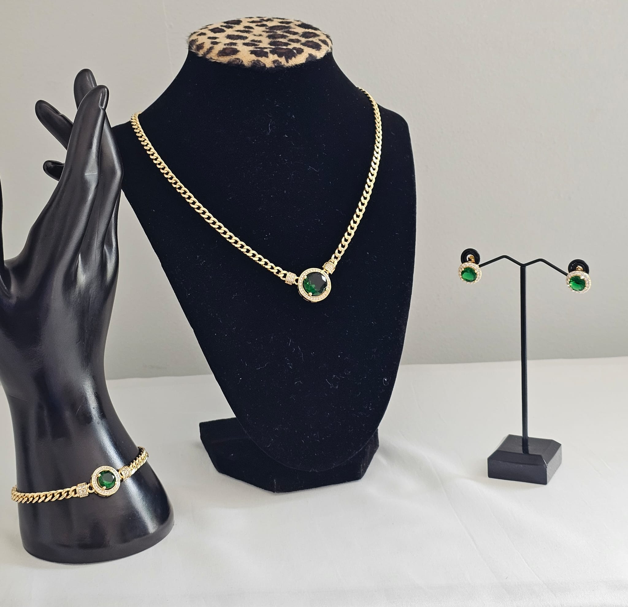 Complementing the necklace, the bracelet and earrings share the same refined aesthetic. The bracelet features a slim chain with a central charm that mirrors the necklace’s faux emerald, set in a matching bezel setting. The earrings, designed as short, elegant drops, each feature a faux emerald that catches the light beautifully. This cohesive set brings a touch of luxury and timeless style to any ensemble, making it a versatile addition to your jewelry collection.