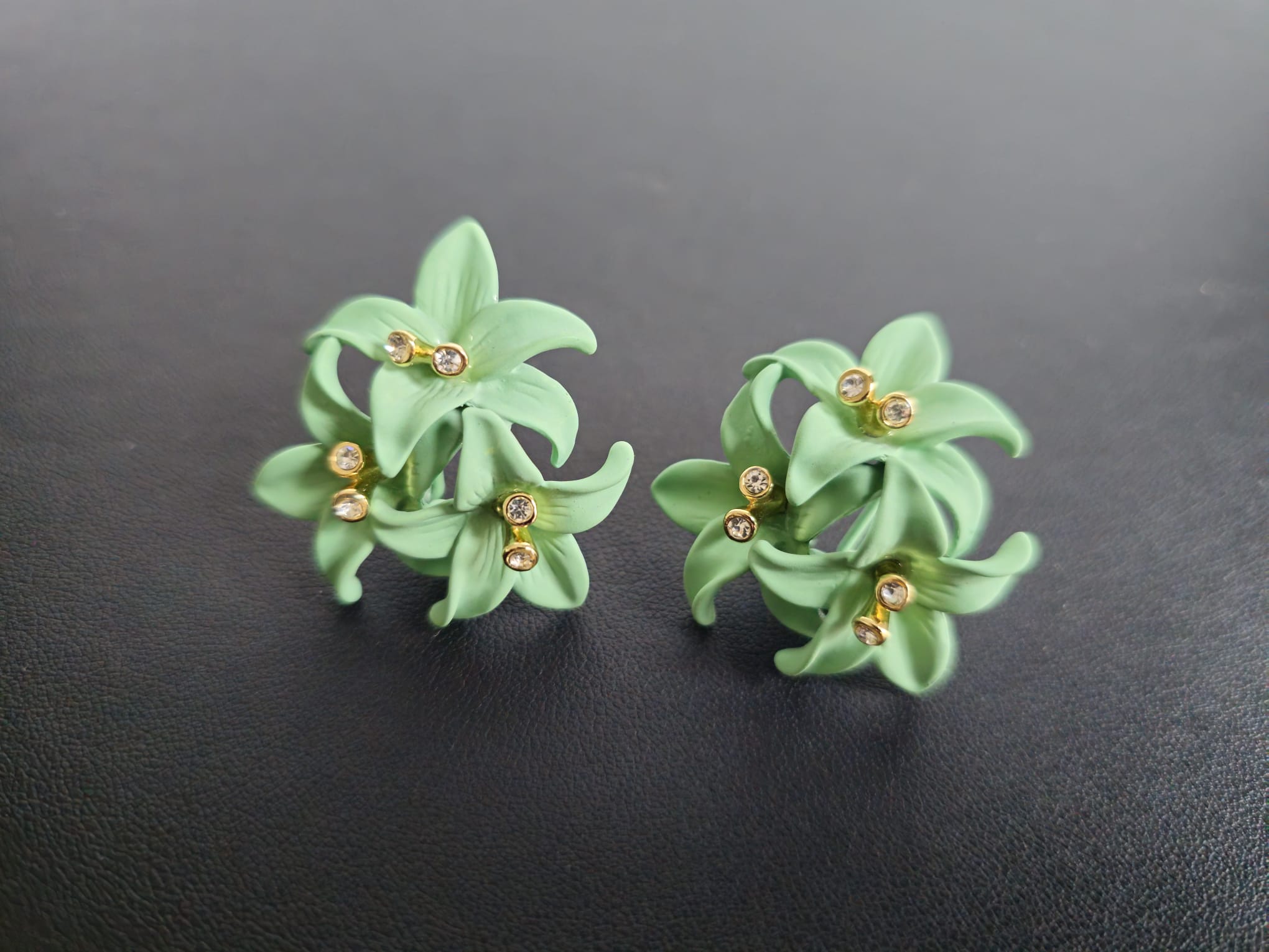 At the center of each flower, two sparkling stones are set, adding a touch of brilliance and sophistication. These stones catch the light beautifully, creating a dazzling effect that draws attention and adds a touch of glamour to the design. The combination of the green petals and the sparkling center stones creates a harmonious and eye-catching look.