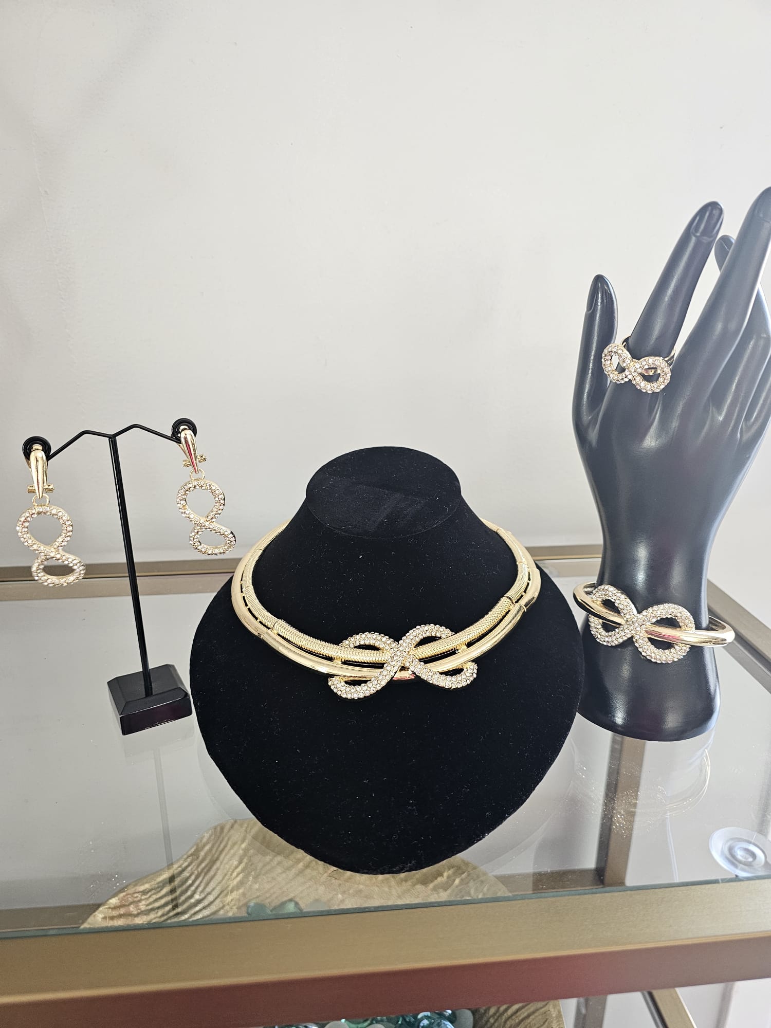 The bracelet follows the same design, with the eternal symbol placed delicately along the band, each symbol framed with tiny silver stones that sparkle against the gold. The bracelet adds a subtle yet meaningful touch to the wrist, completing the set with elegance. The earrings are a pair of drop-style pieces, each featuring a smaller version of the eternal symbol with silver stones set within the design, creating a graceful and timeless effect that sways with movement.