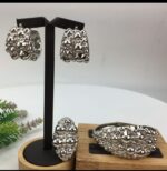 “Diamond Cut Bracelet Set” is a stunning jewelry collection that includes a bracelet, earrings, and a ring, available in gold, silver, and a unique three-toned combination. Each piece in this set is meticulously crafted with a textured design featuring small, delicate balls, adding a touch of sophistication and charm.
