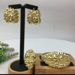 “Golden Waves Bracelet Set” is a stunning jewelry collection that includes a bracelet, earrings, and a ring, all crafted in radiant gold with a unique textured design. Each piece in this set features intricate crevices and a textured surface, creating a captivating visual and tactile experience.